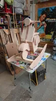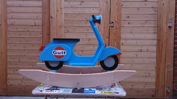 Die Wippe ist komplett fertig und wird morgen verleimt. Seitenhauben sind auch schon fertig ausgerichtet, auf dem Bild nur nicht aufgesteckt. Zweite Seite vom Beinschild, Sitzbank und Lenkkopf noch verdübeln und alle nötigen Kanten noch mit der Fräse abrunden, dann kann auch die Vespa verleimt werden... und dann heißt es wieder schleifen, schleifen, schleifen...