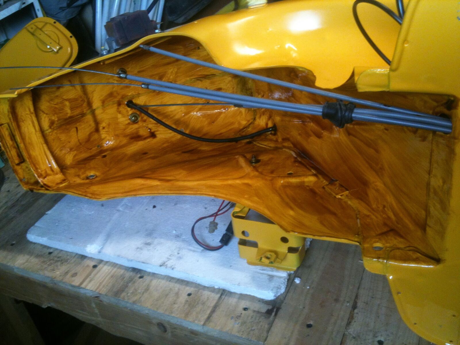 Momentan kümmere ich mich grade um den Rahmen, die Vespa hat einen apfelgrünen Olack drunter. (Stehe ich persönlich garnicht drauf), danach wurde sie erst orange überlackiert und zu guter letzt ziemlich beschissen schwarz mit farbroller überlackiert...