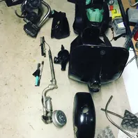 Momentan kümmere ich mich grade um den Rahmen, die Vespa hat einen apfelgrünen Olack drunter. (Stehe ich persönlich garnicht drauf), danach wurde sie erst orange überlackiert und zu guter letzt ziemlich beschissen schwarz mit farbroller überlackiert...