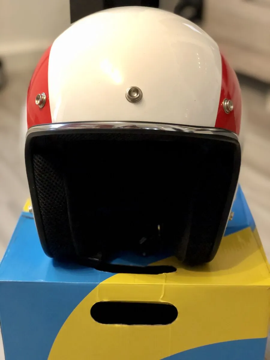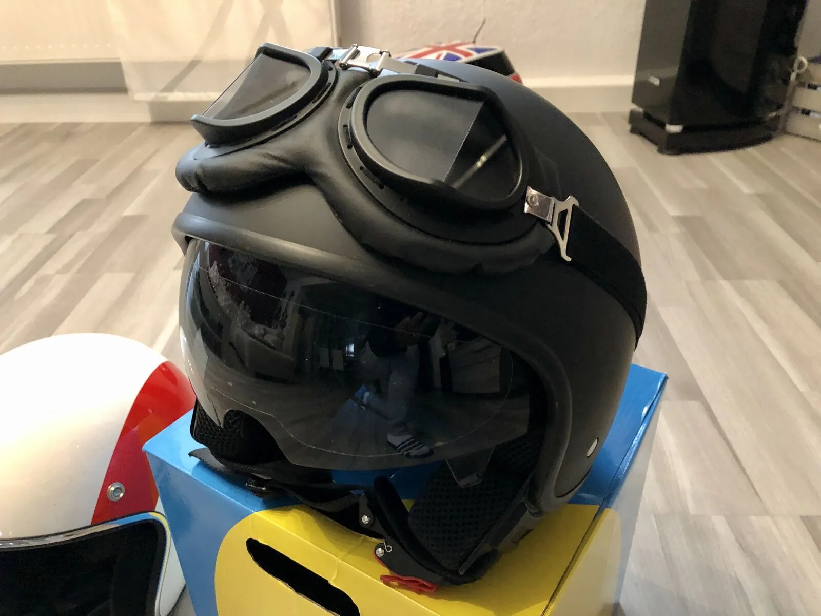 der andere helm / größe m, wurde von meiner frau sehr sehr selten getragen (wenn es hochkommt vielleicht gerade 5 mal) und wird so wie abgebildet inklusive "fliegerbrille" verkauft da wir für unsere neue vespa die nun gut 50 jahre alt ist auf alte "retro" helme zurückgreifen möchten.