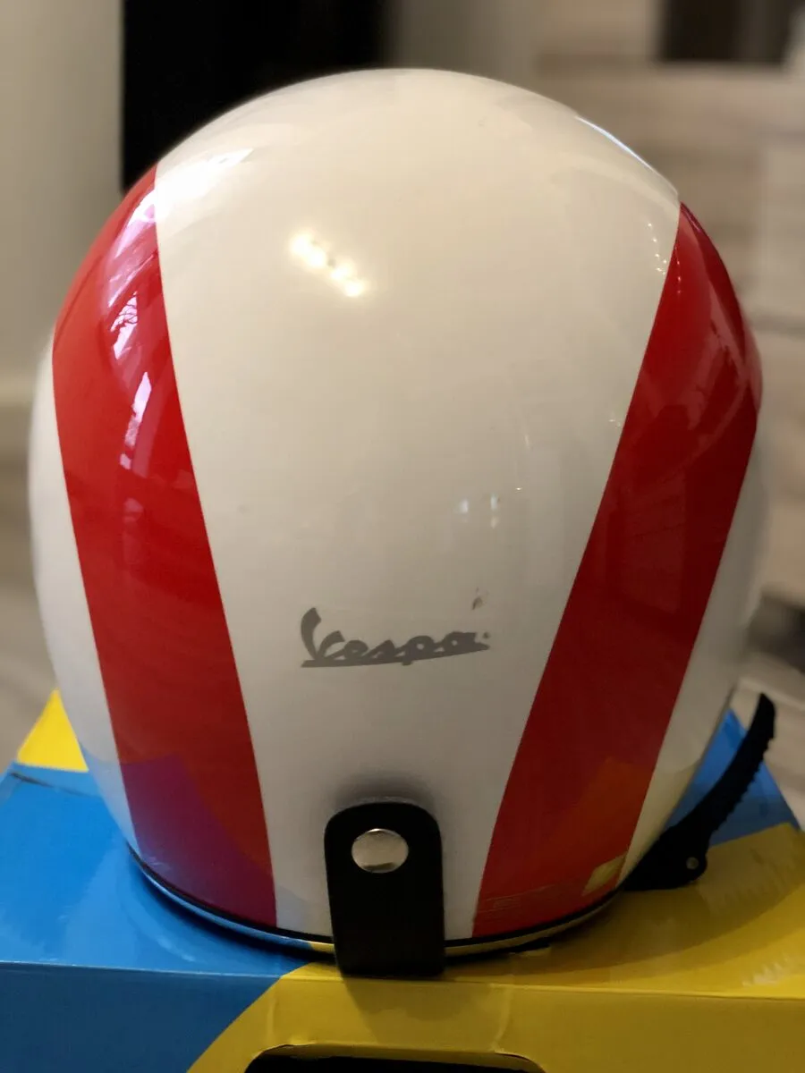 der eine, original vespa (casco nazioni 2.0 /größe s) wurde von meinem patenkind bei unseren gemeinsamen ausflügen getragen und ist ihm mittlerweile leider zu klein. der zustand ist eigentlich noch sehr gut, jedoch hatte er es nicht so mit dem "weglegen" des helms. sind leider ein paar kleine kratzer an diesem die sich sicherlich raus polieren lassen......