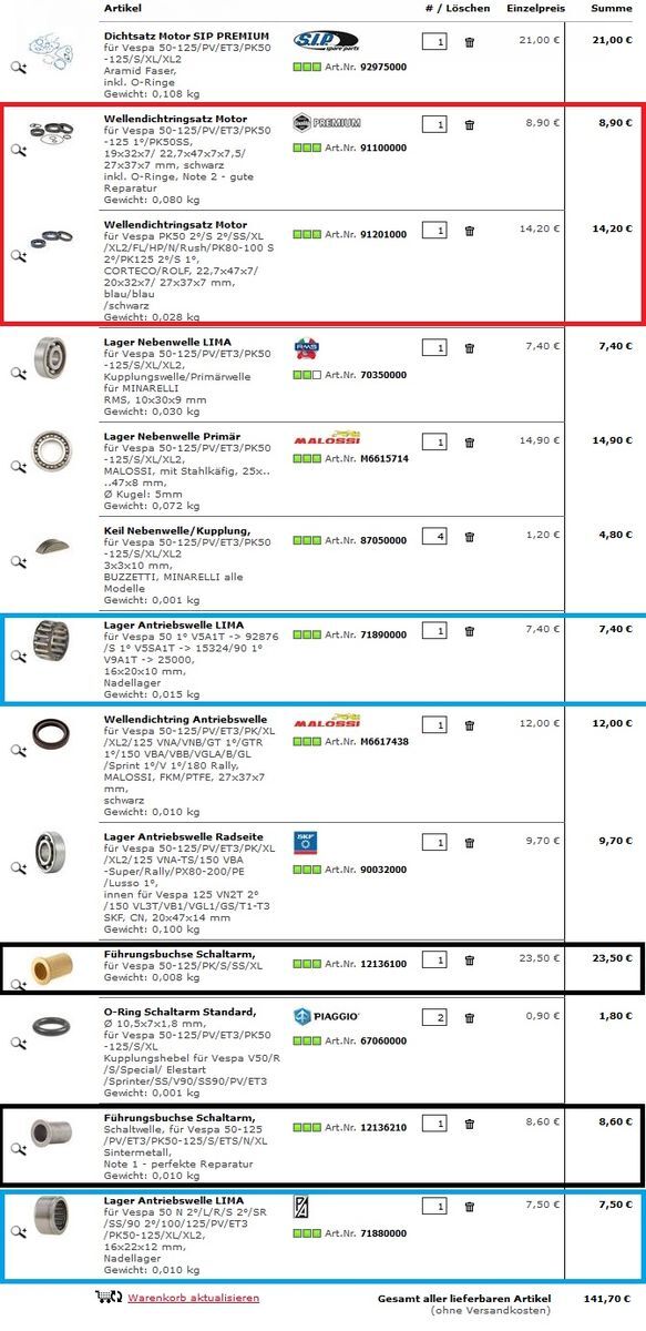 Auf deiner Liste fehlen ! Kupplung, Zahnkranz/Feder und Sicherungsscheiben, Bolzen Schaltarm, frisches ÖL, Kerze usw.! Das sind Teile die du im Vorfeld besorgen kannst, aber bestellen wirst du dann trotzdem noch einmal...