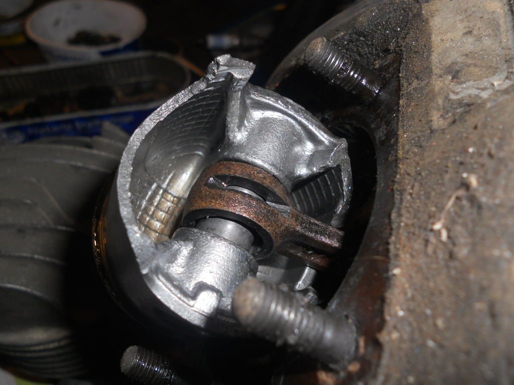 Also ans Werk,Haube runter ,Zylinder runter, und -au weia, das hab ich noch nie gesehen, siehe Fotos, die untere Hälfte des Kolbens fehlt total,