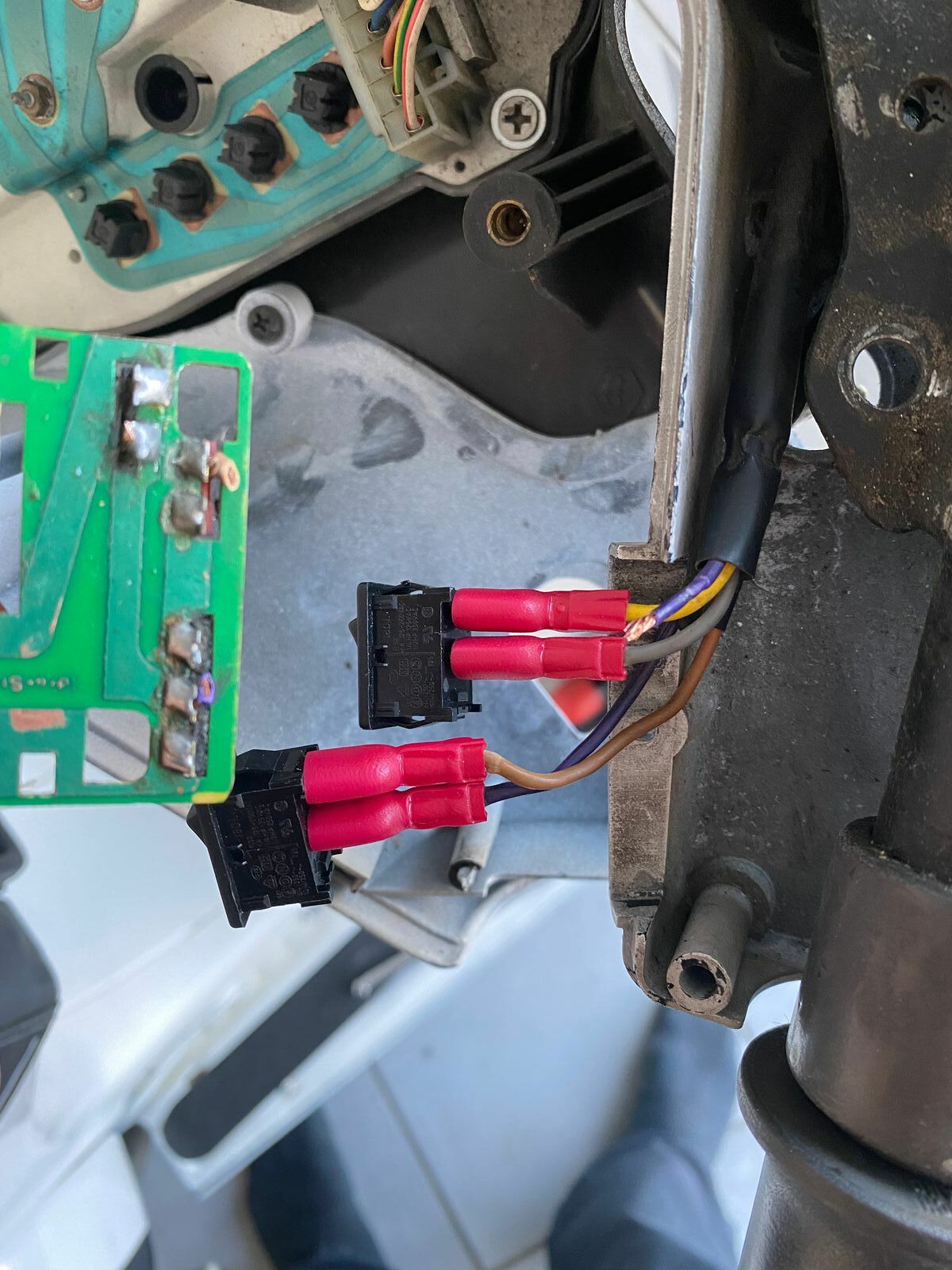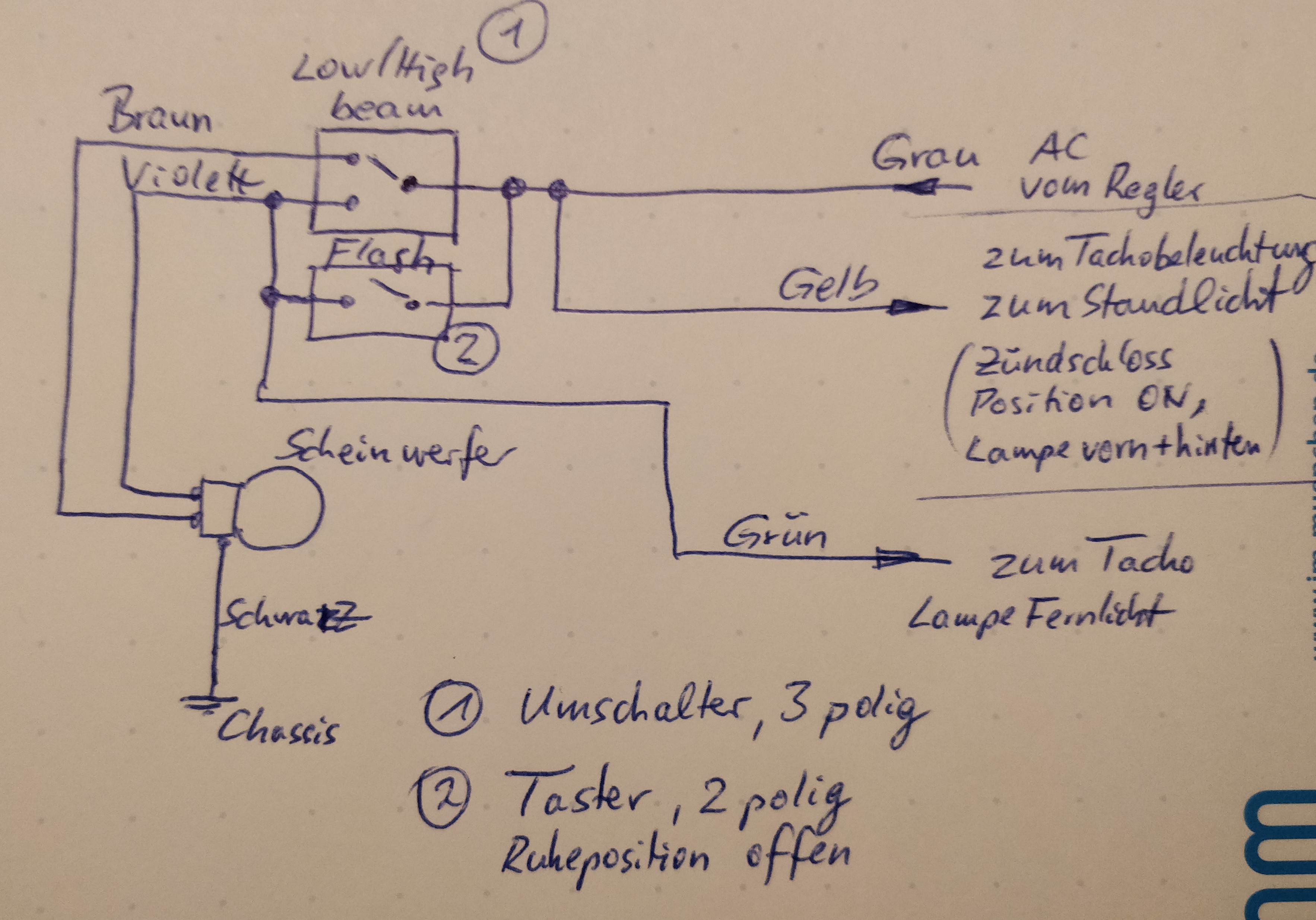In meiner Naivität dachte ich, dass ich jeweils nur die Kabel für Abblendlicht (gelb/grau) und Fernlicht(lila/braun) jeweils auf einen Schalter legen muss.