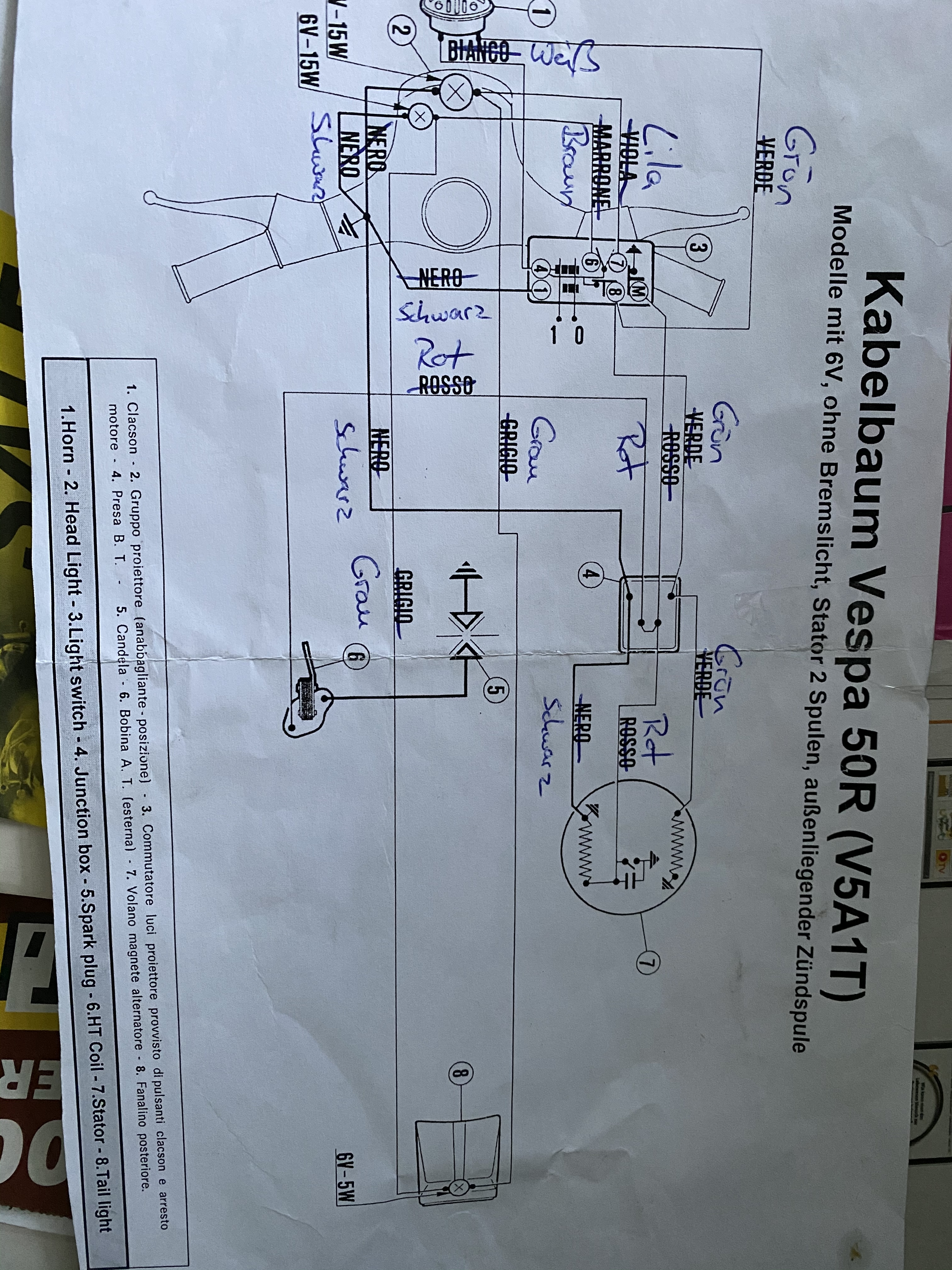 • Nabend, vllt hab ich bei euch eher GlĂŒck 😅 ich hab fĂŒr ne V50 R ohne Bremslicht und ori 6V ZĂŒndung nen neuen Kabelbaum bestellt, laut Beschreibung und Bild des eBay VerkĂ€ufers hat der eigentlich auch gepasst. Am Locht vorne kommen ein braunes, ein lila (blaues) Kabel und 2x schwarz aneinander raus... ich vor lauter Freude den Kabelbaum eingezogen und Siege da vorne am Scheinwerfer kommt 1x lila, 1x braun, 1x schwarz und 2x grau raus. Leider bin ich kein Elektriker😬 daher die Frage kann mir bitte jemand mit dem Schaltplan dazu sagen ob ich die Kabel anders anschließen kann damit es funktioniert und ich keinen neuen Kabelbaum einziehen muss. WĂ€re euch sehr dankbar 🙏