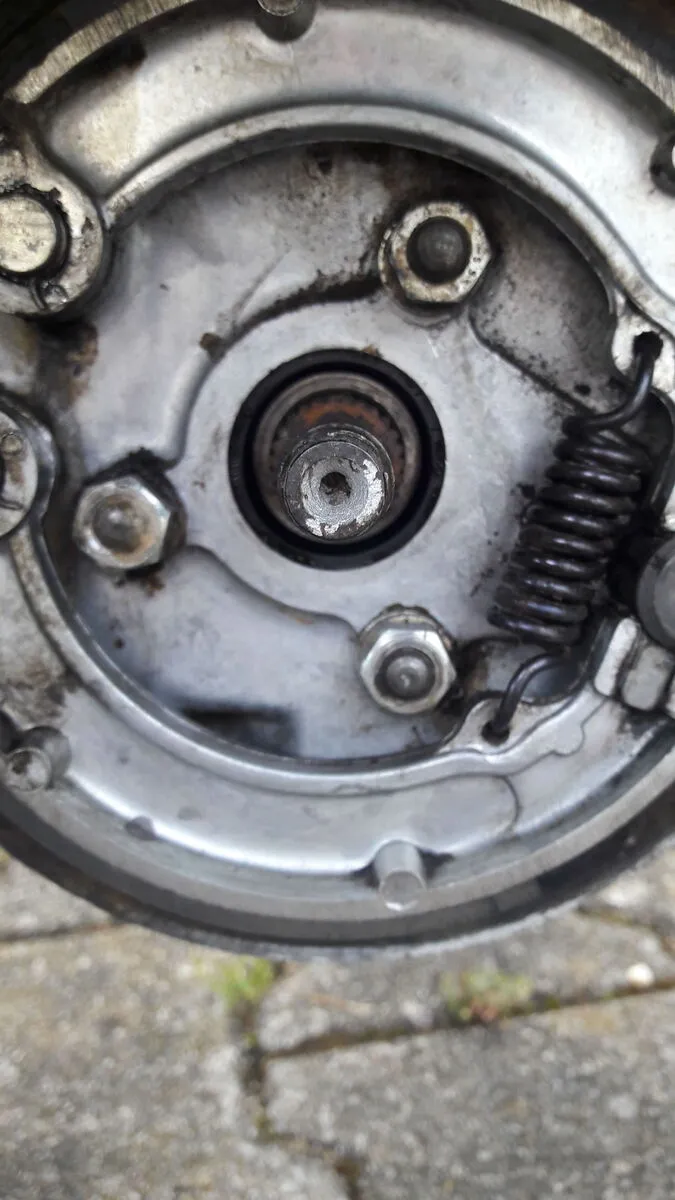 Die Bremsankerplatte muss abgebaut werden, dann kann der Ring durchgeschlagen und der neue eingebaut werden. Offene Seite zum Getriebe hin .
