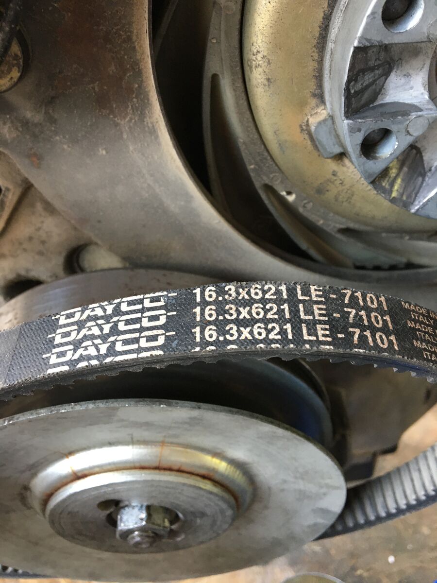 Habe den 621 x 16,3 Dayco Belt drauf, der meiner Meinung nach ca. 0,8 mm breiter als der vorherige ist.