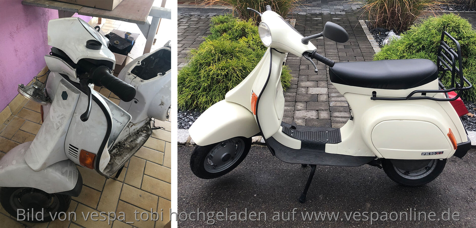kurz und knapp: mein Name ist Tobi, ich komme aus dem Schwabenland, habe eine alte Vespa (PK50XL (V5X3T) - BJ 1991) meines Opas geerbt, anstatt Sommerreise steht dieses Jahr die Vespa auf der Agenda. Ich habe sie auseinander gebaut, eine Motorrevision hat Motoerevo gemacht. Ich habe alles neu lackiert und nun geht es an den Zusammenbau – einige Teile habe ich bei SIP neu gekauft. Leider habe ich mir das einfacher vorgestellt und freue mich, wenn Ihr mir helfen könnt.