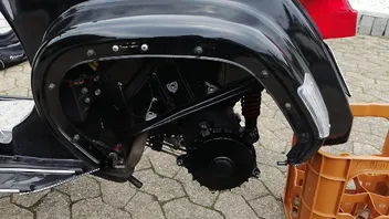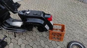 Die Vespa auf einer Wasser Kiste aufgebockt und das Hinterrad demontiert.