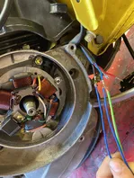 Diese ZGP müsste die folgende Kabel haben: schwarz-blau-grün-grün-weiß-rot, von denen grün-weiß-rot zur Blackbox gehen (das ist das amateurhaft befestigte blaue Kästchen hinten am Motor) und schwarz-blau-grün im Kabelkästchen landen. Nimmt man das Polrad ab, sollte dann eigentlich auch eine ZGP zu Tage treten, die mit 5 Spulen in Sternkonfiguration und einem schwarzen Pickup ausgerüstet ist.So müßte das sein!