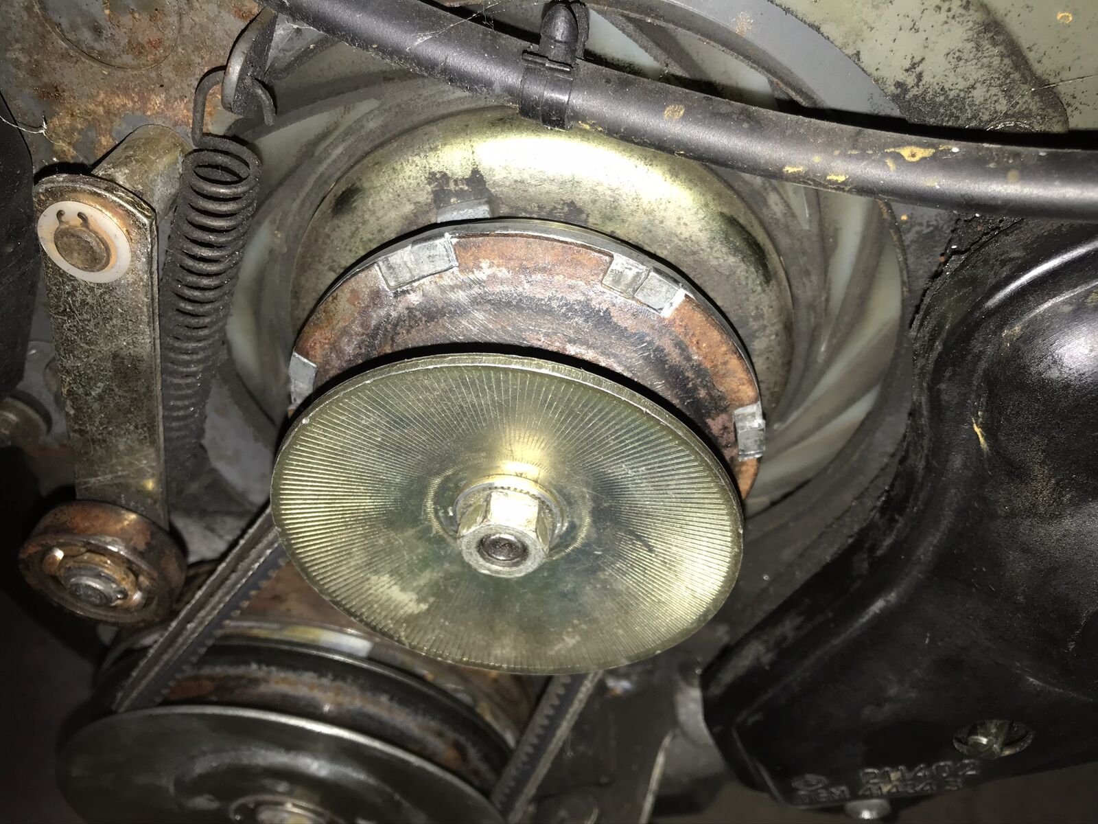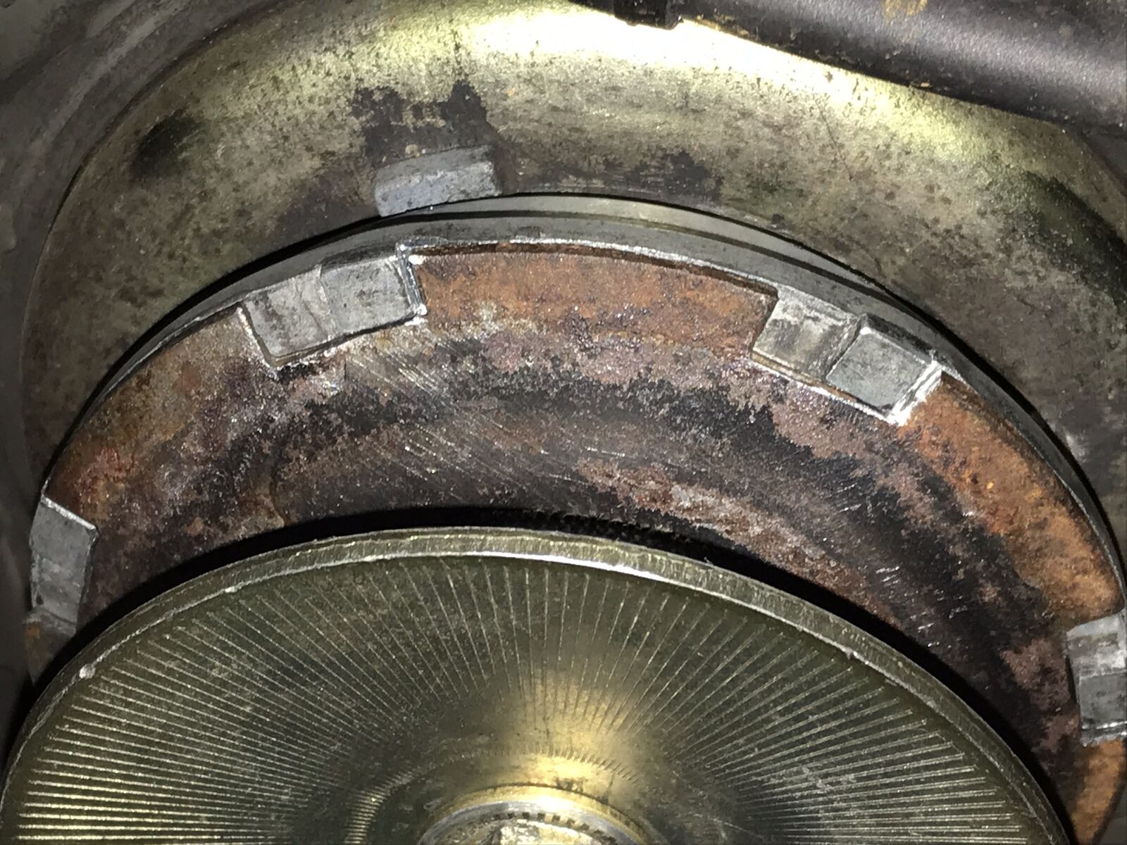 Nun zu meinem Problem: Meine Automatika sprang problemlos an. Beim einlegen des Ganges wollte sie schon aber von allein losfahren. Dachte erst, die Kupplung ist verdreckt, da sie von außen nicht besonders schön aussah. beim zerlegen der Variomatik ist mir dann die obere Riemenscheibe aufgefallen. Der Teil, in dem die Variatorrollen sind, besteht aus Aluminiumdruckguss mit einer aufgelegten Riemenscheibenhälfte aus Stahl. Diese sind nur durch eine Verzahnung gegen verdrehen gesichert. Diese Verzahnung ist bei dem Teil komplett schräg ausgearbeitet, so dass die Scheibe auf der Schrägen verrutscht und dadurch den Scheibenabstand verringert. Ich denke, dass dadurch die Drehzahl an der Kupplung erhöht ist und sie deshalb schon einkuppelt.