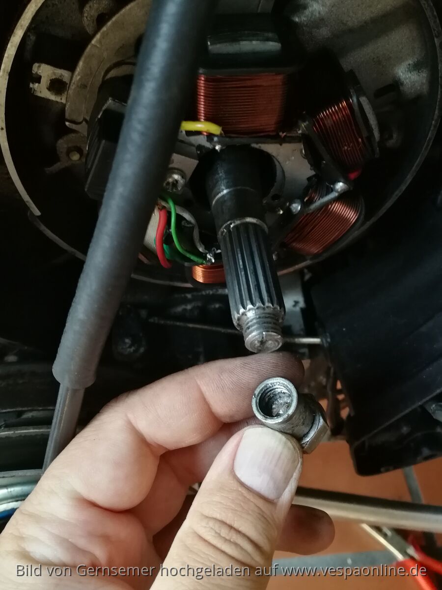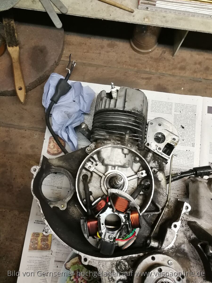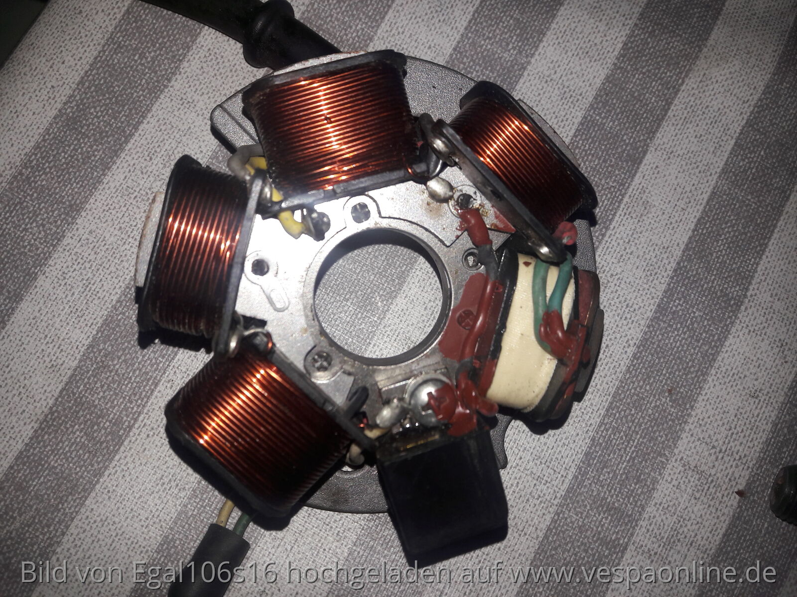 Übrigens, dort wo die grünen Kabel dran gehen, diese Spule hat stark durch die falsch montierte Ankerplatte im Polrad geschliffen.