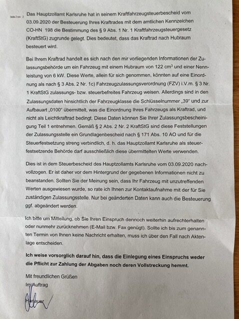 Das sicher auch. Trotzdem ist der Zoll als zuständiger Ansprechpartner zu sehen. Denn er setzt die Rechtsgrundlagen EU-Richtlinien 92/61/EWG und 2002/24/EG um bzw. ist zum Einzug der passenden Steuer beauftragt. Die Zulassungsbehörde ist nur Datenlieferant. Das Merkmal „Kraftrad“, was normal Steuerpflicht auslöst, wird ja durch eine unpassende Hubraum-Angabe flankiert und bei näherem betrachten muss auffallen, dass die Erstzulassung genau in diese Regelung passt.