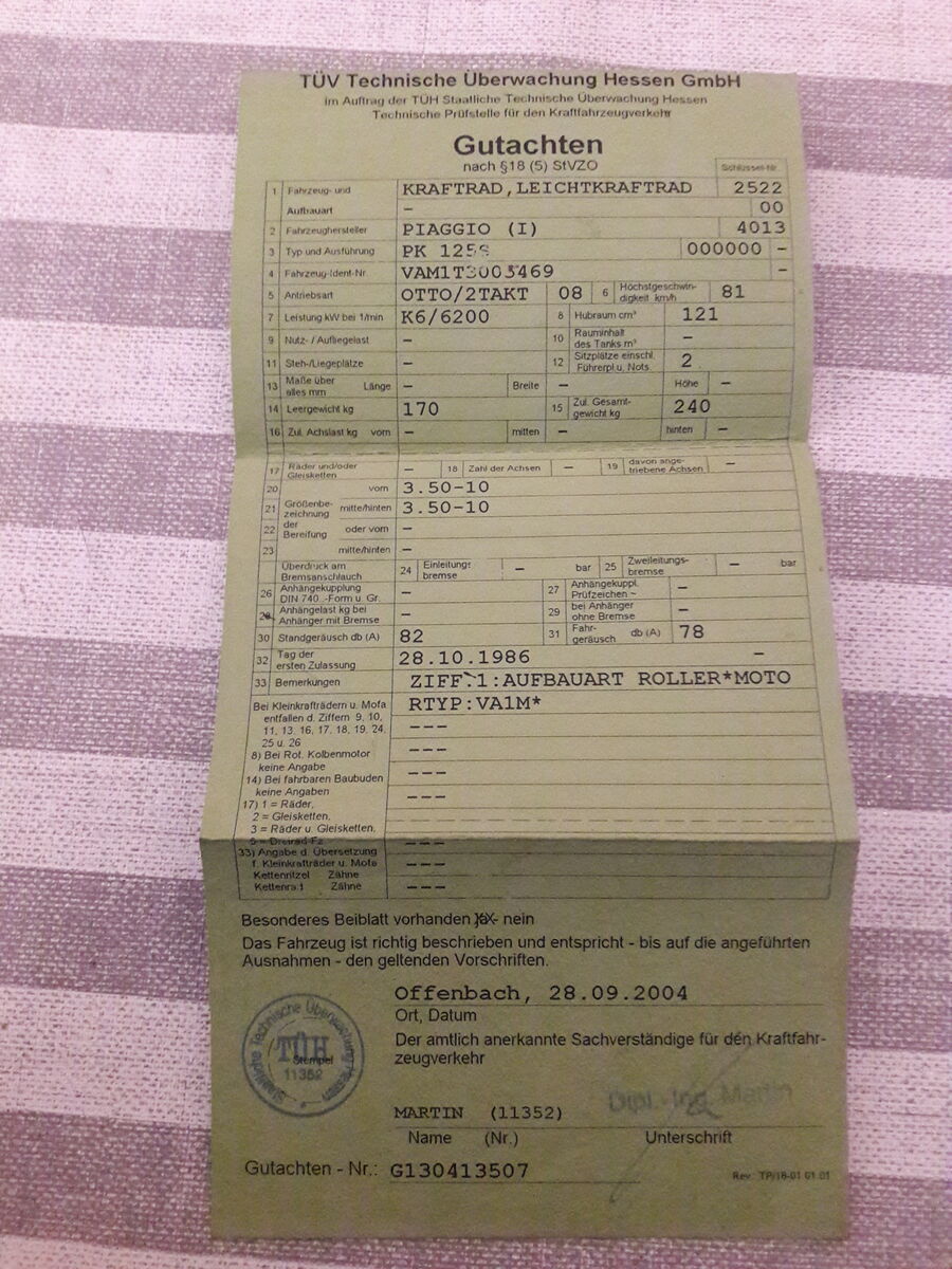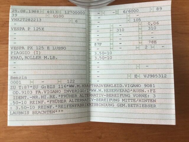 Deine Vespa ist gültig zugelassen, keine Sorge. Ich bin selbst gerade am überlegen, wie man das am klügsten und wirtschaftlichsten in Ordnung bringt.