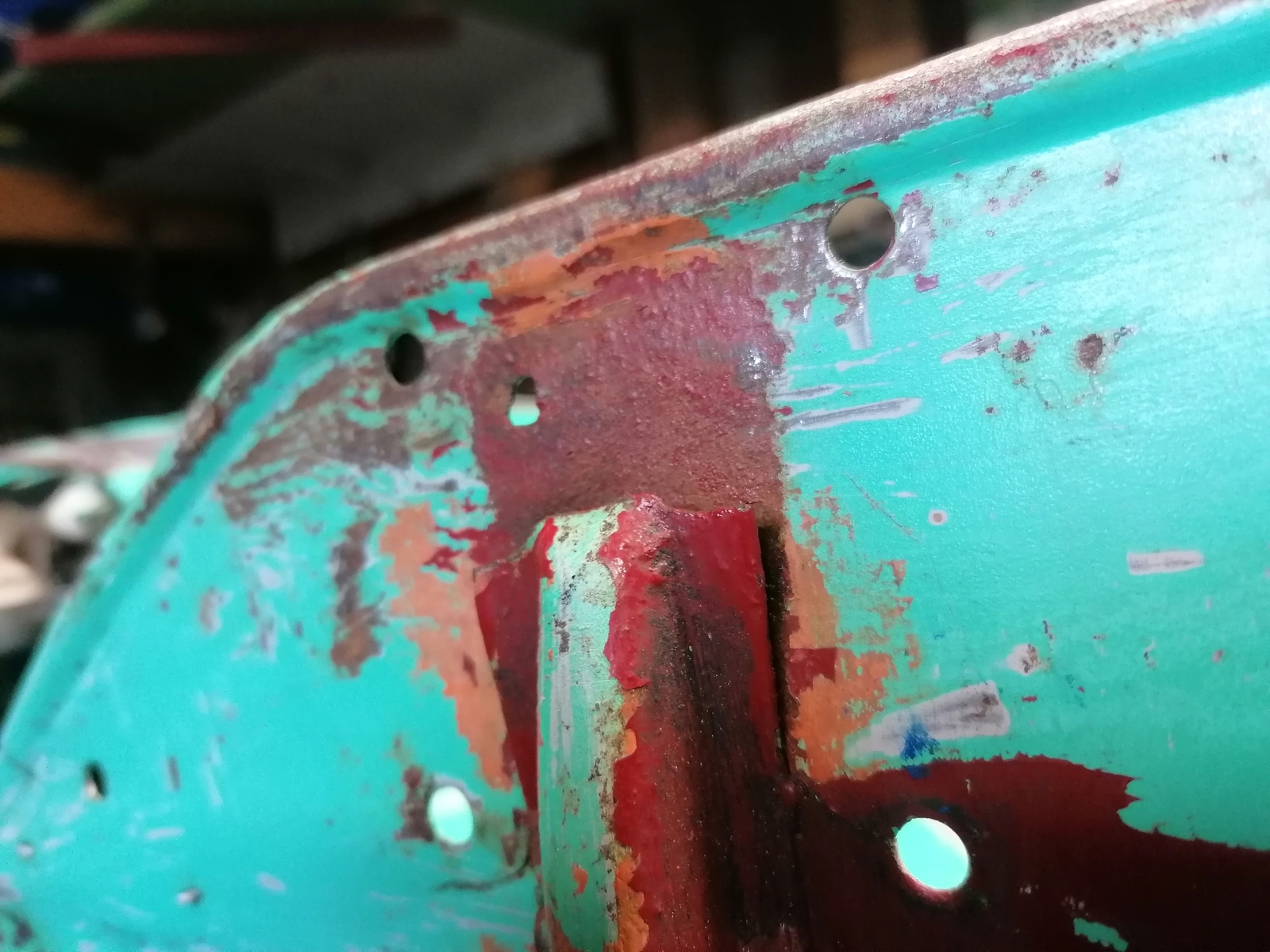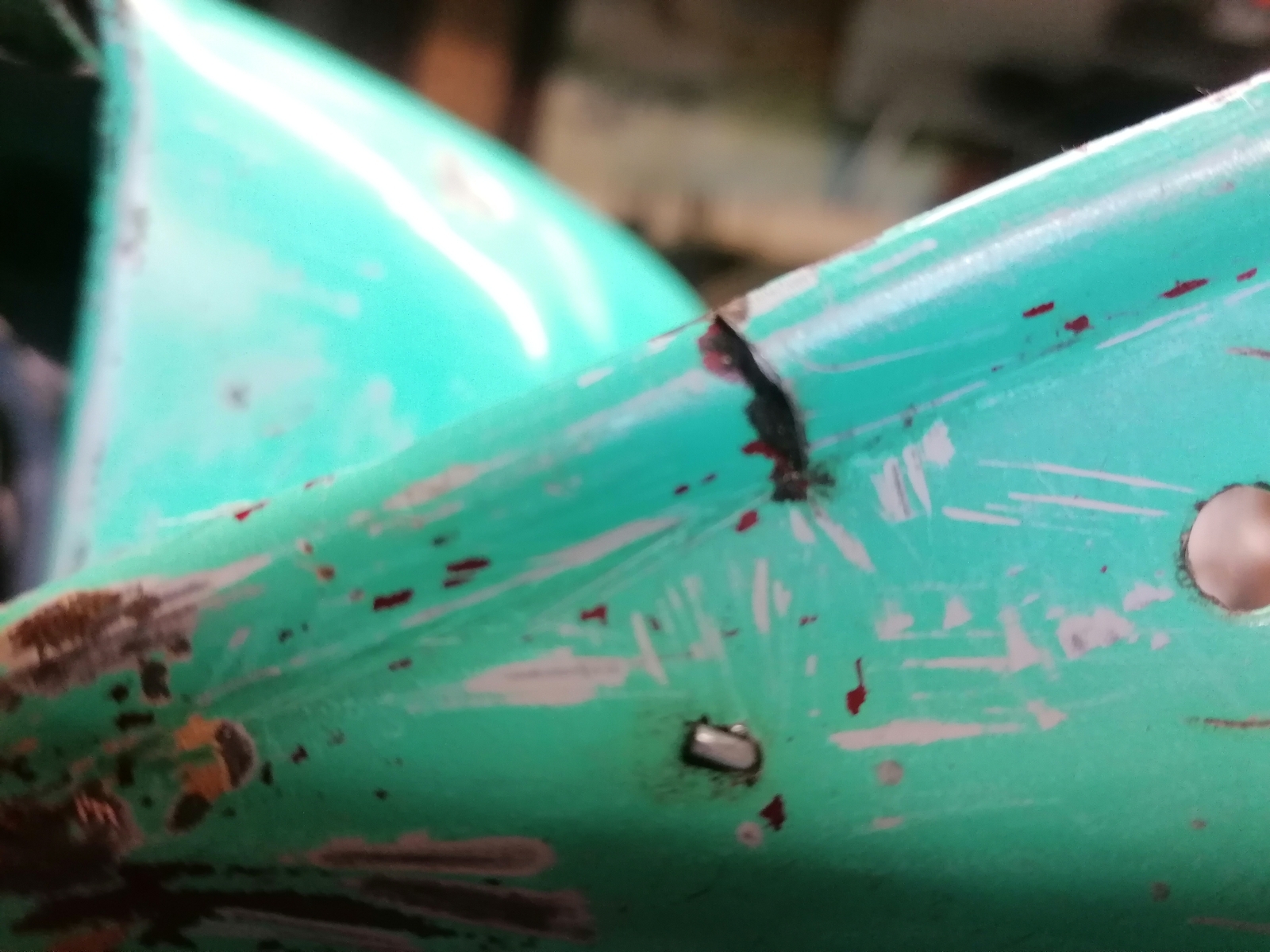 Hier die Bilder vom Riss und den Streben. Für eine BJ 1970 steht die vom Rost her sehr gut da würde ich sagen. Allerdings stand sie ja auch 32 Jahre trocken inner Ecke. Nur als sie gefahren wurde wurde sie nicht pfleglich behandelt. So viele Dellen und Knicke wie sie hat. Wird alles noch gewaxt damit der Zustand untenrum so bleibt. Das Orange ist vermutlich Bleimennige sagte ein alter Lackierer mal. Strebe und Riss muss ich mal von nen Kumpel machen lassen. Muss ich nur schnell machen lassen weil der im Frühjahr nach Ungarn Auswandert ;(