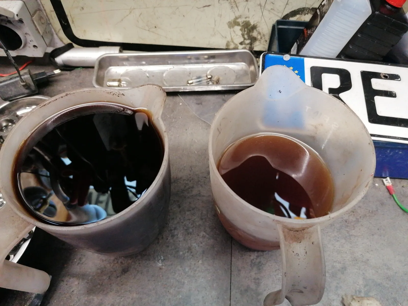 Links der Sprit aus den ersten 2 mal. Rechts nach den dritten mal. Schon etwas klarer.