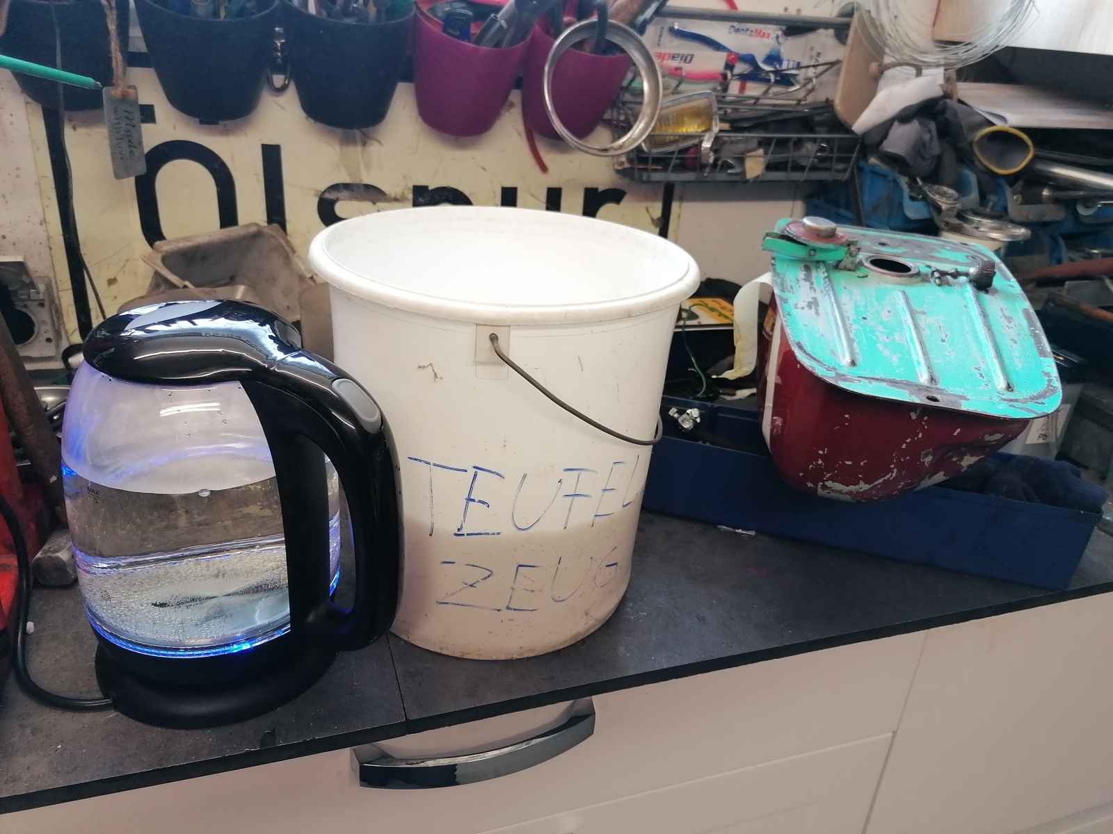 Reinige seit längeren ja schon den Tank der Rundlicht. Erst habe ich den Tank mit Rostio Tankentroster grob entrostet was auch eigentlich gut funktionierte. Aber diese "Harzschicht" aus alten Sprit und Öl hat es nicht angegriffen und drin im Tank geblieben.