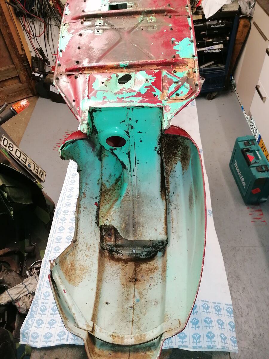 Leider wurde am Beinschild flächig gespachtelt. Mal gespannt was da drunter ist. Lack oder kein Lack. Aber das dauert noch bis ich dahin komme.