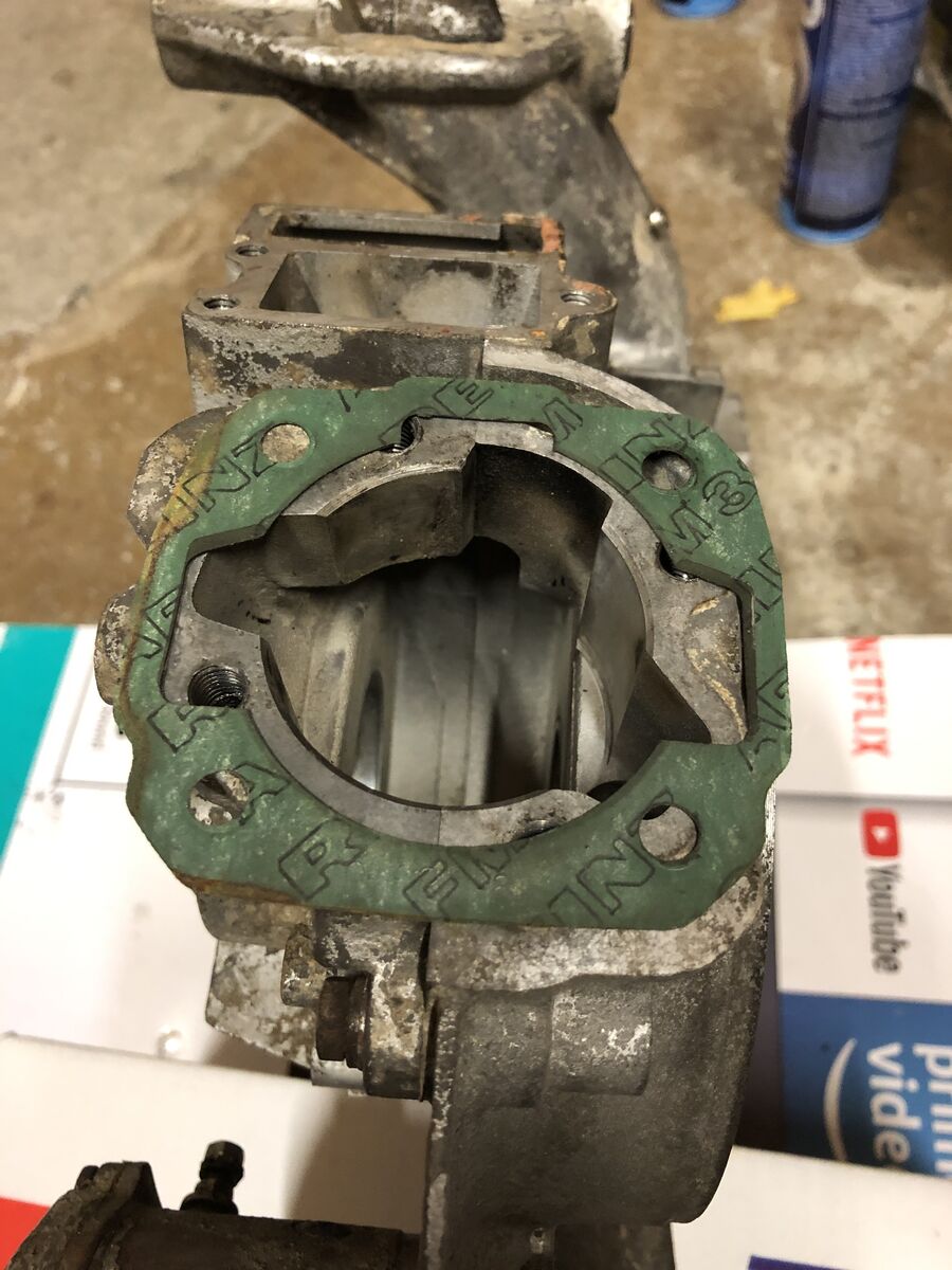 Er wird einfach gemerkt haben, daß es nicht einfach genügt, etwas aufzuschweißen und darauf rumzuhobeln und es dann einfach vorbei war. Der Rest von seinem Teilen (die vermutlich der Einfachheit halber die normalen Komponenten der PK 125 Automatik waren), den er einfach gleich lassen wollte, kommt nichtmal mit einem normalen Smallframe Zylinder axial zurecht, geschweige den mit einem ausgeräumten Langhub-Polini 130...