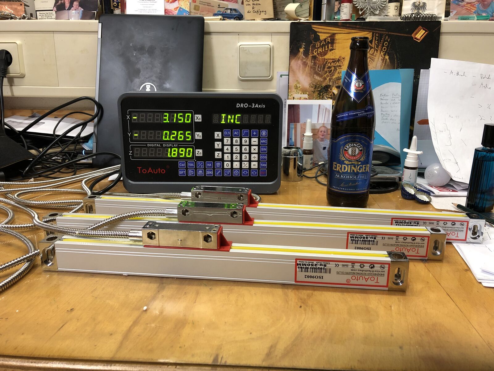 Also bastel ich die Glasmaßstäbe am Samstag mal an meine alte Maho. Die neuen Bohrungen für die anderen Stehbolzen könnte man ja noch per Handrad setzen, aber den Membrankasten ohne Anzeige rauskurbeln habe ich keine Lust...