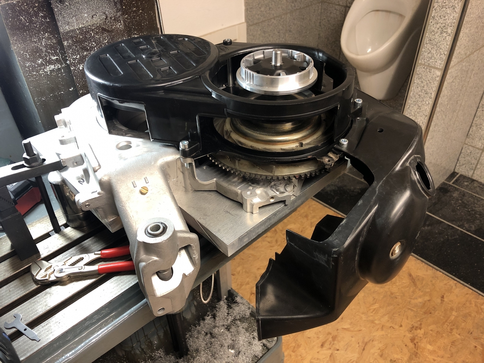 Also schon mal verdammt eng wird es zwischen dem Überströmer und dem Zahnkranz. Da muß ich etwas vom Überströmer außen wegfräsen und viel Wand bleibt da nicht mehr.