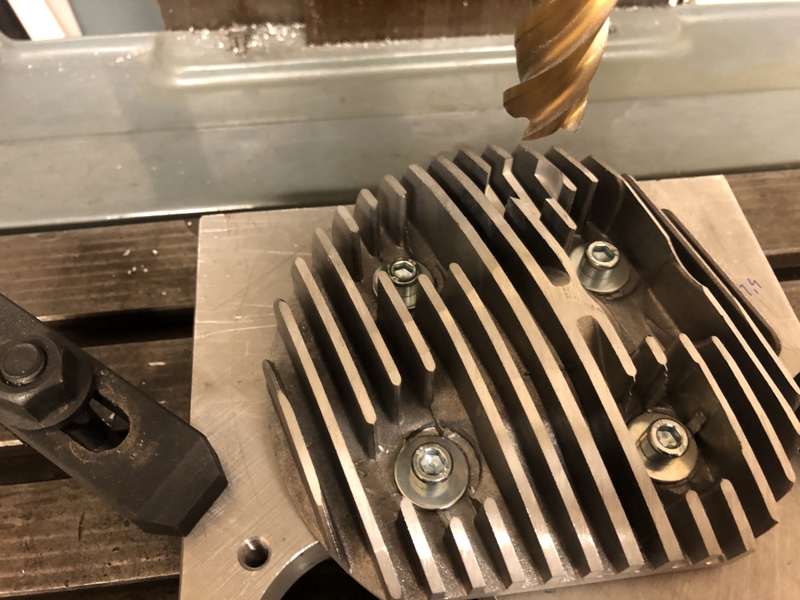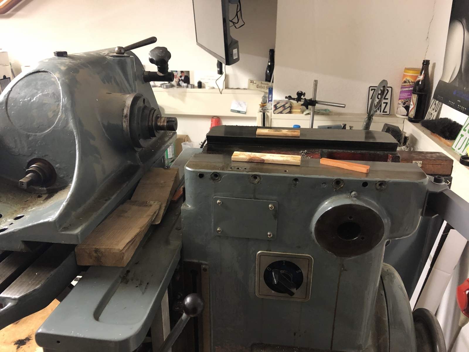Den Spindelbock kann ich hin und her wackeln in dem vollen Spiel, das der Schwalbenschwanz hat, wenn die Klemmleiste von ihren Einstellschrauben befreit ist, die Klemmleiste ist locker, geht nur deshalb nicht raus, weil sie noch von zwei Stiften gehalten wird, für die ich momentan keine Idee habe, wie ich die ziehen soll. Mir ist auch schleierhaft, was sich der Konstrukteur der Maschine dabei gedacht hat.