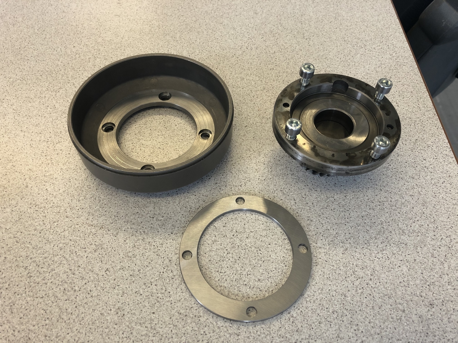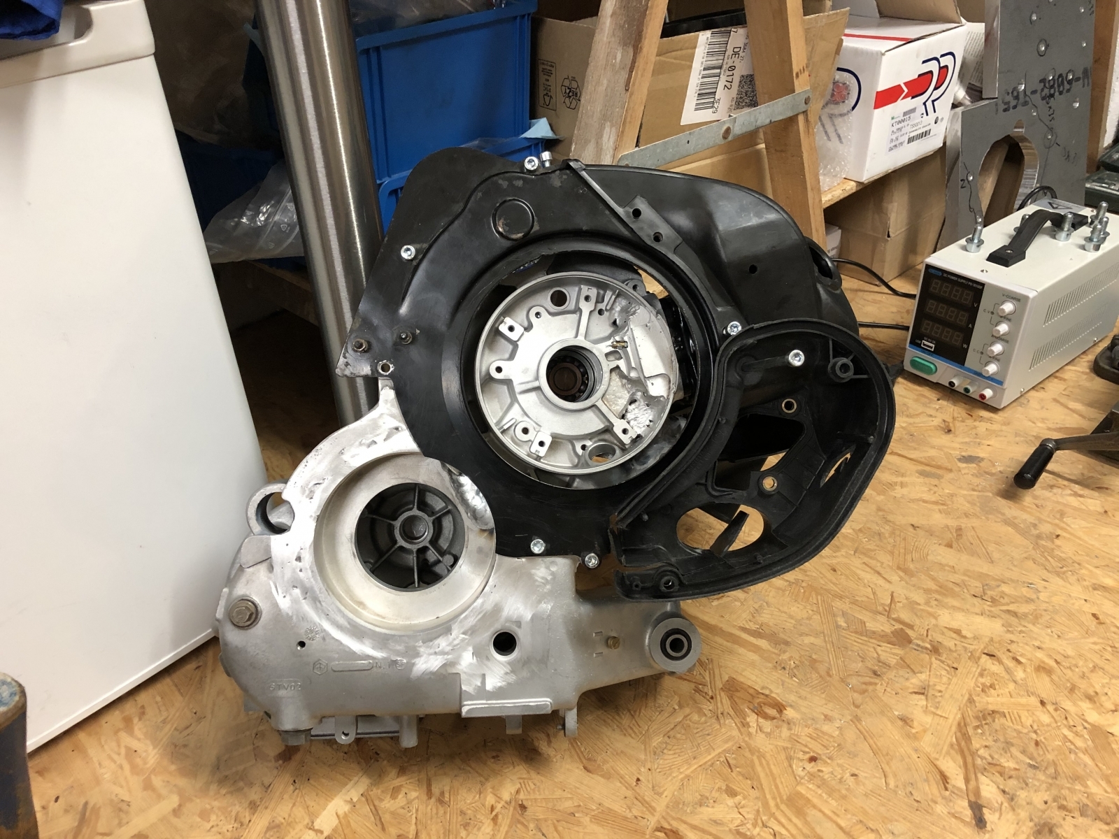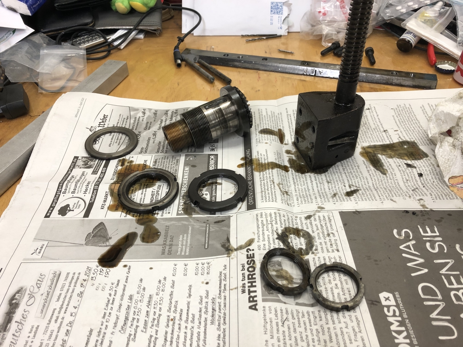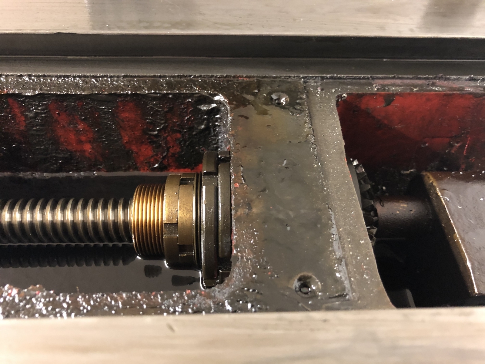 Und weiter bewegt sich die Mutter ein paar Winkelgrade. Gerade so, daß es ihre Lagerbuchse im Gehäuse etwas axial hin und her zieht.