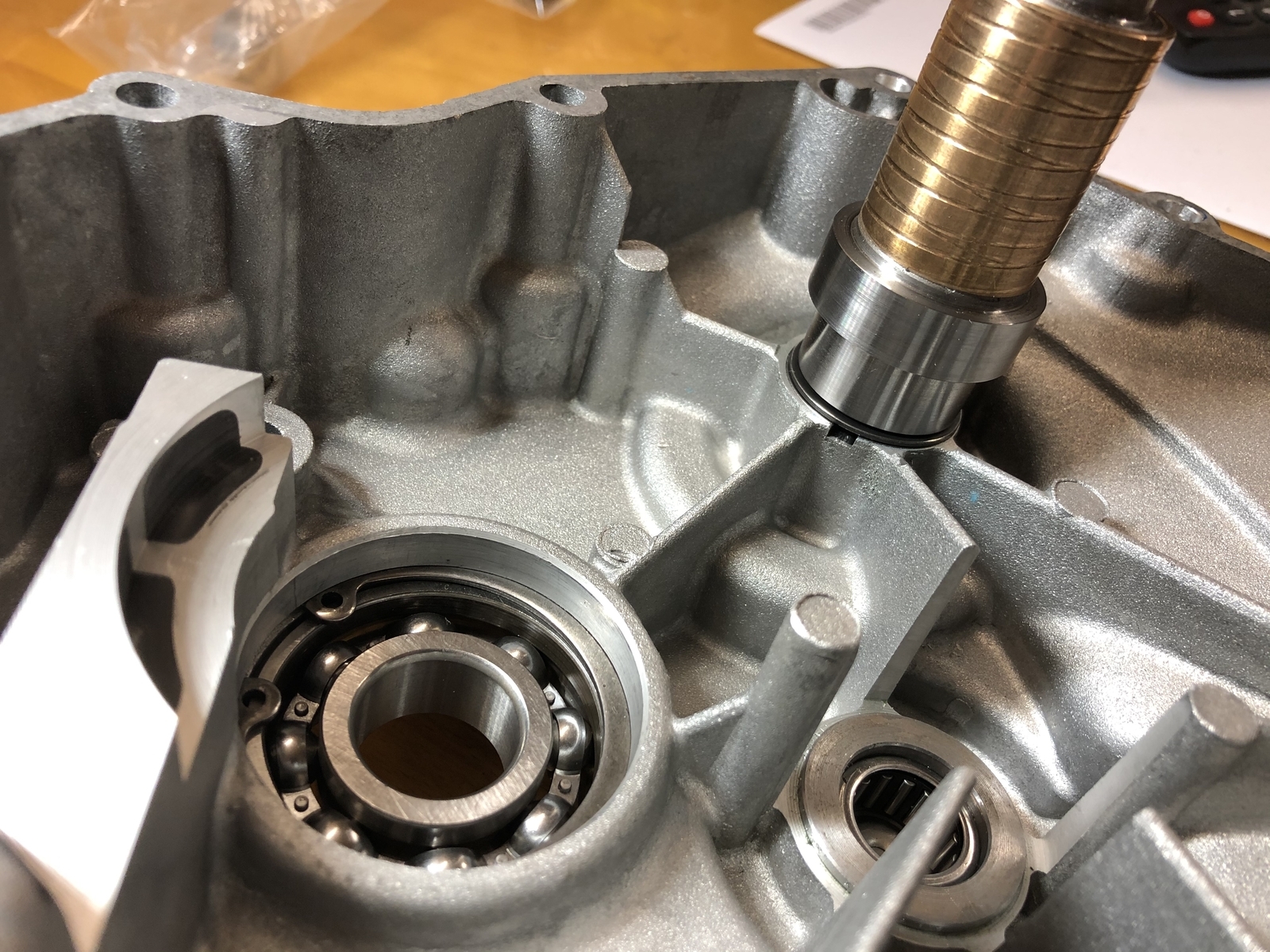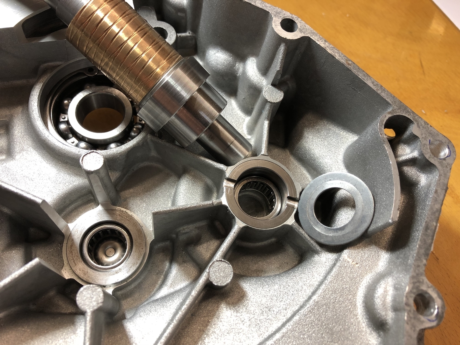 Ich muß jetzt nochmal schauen, ob die Zwischenwelle Deckelseitig auch noch eine Scheibe braucht (eigentlich nicht, die Verzahnung zieht die Welle in ihr neues Kugellager gegen den Innenring). Außerdem hatte ich das so ausgelegt, daß die Zwischenwelle am Lagerbuchsenboden anläuft eigentlich.