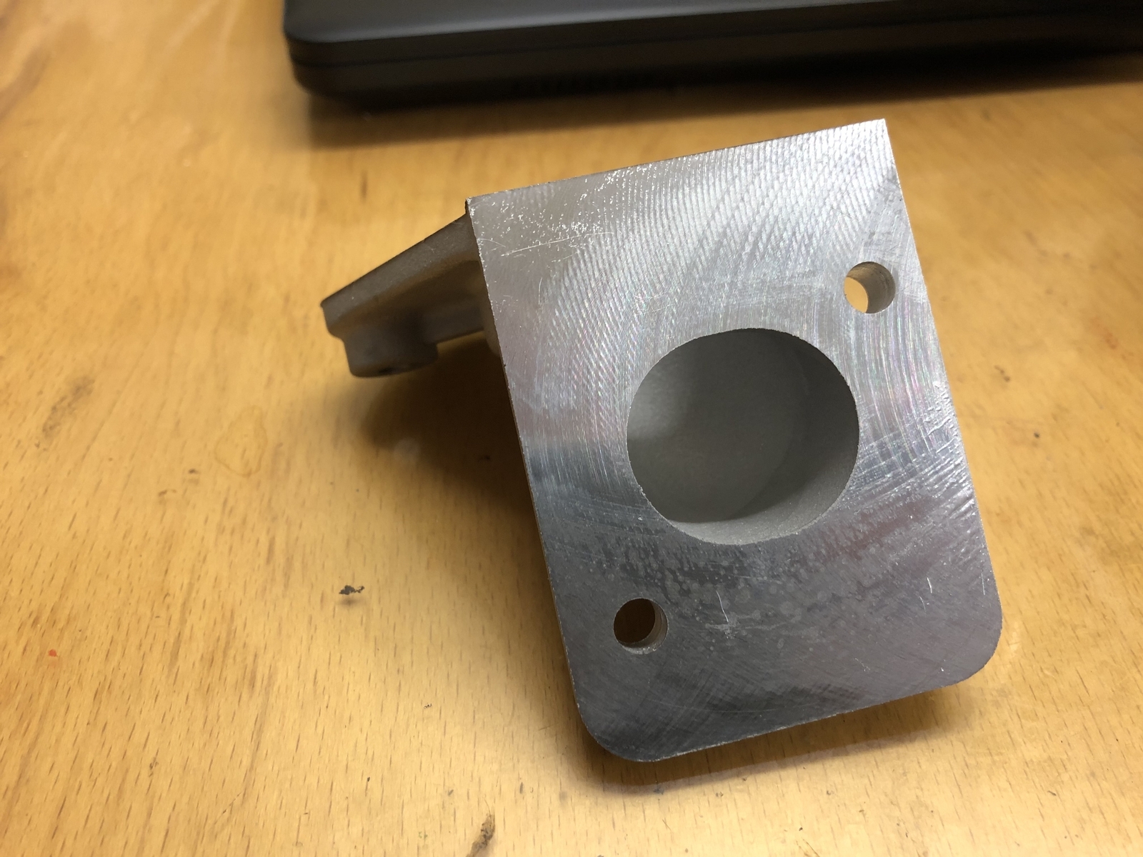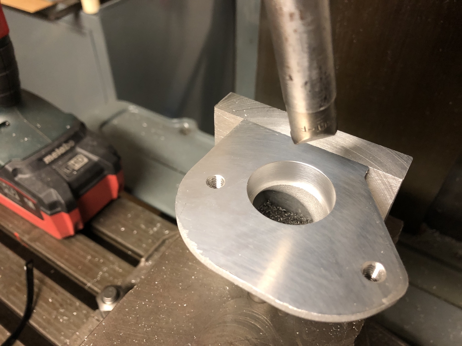 Gleich mal die Anschlußflächen überfräst und die beiden Durchgangsbohrungen gerichtet, Gewinde für den Luftfilter geschnitten und dann den 29er Durchmesser ausgespindelt.