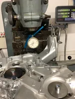 Weiter, aber das ist mir schon länger aufgefallen, ist durch die Einschweißerei des Alutopfes der obere Teil mit dem Kurbelgehäuse etwas zum Getriebe geneigt. Auch bestimmt 1,5 mm, was letztlich auch etwas zu dem schief laufenden Riemen beiträgt. Auch halb so wild, ich vermittel den Riemenlauf ja mit der finalen Kurbelwelle.