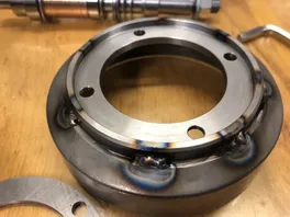 Der gleiche liebe Kollege hat mir den ausgedrehten Kranz des Kupplungskorbes auf meinen selber gemachten Adapterring geschweißt: