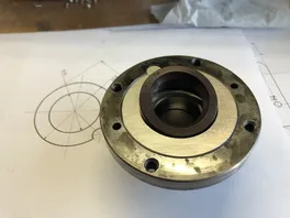 Um dieses große Nadellager zu fahren, habe ich ja meine Speziallagerhülse gemacht mit der Sickerbohrungsverlängerung und extra eine 105er-Vollwange rausgesucht, die auf der Limaseite den dicken Stumpf hat.