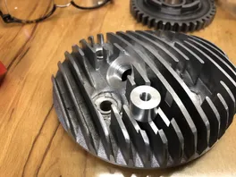 Das kleine Zylinderchen aus Alu, das ich in die von mir gemachte Ausnehmung im Kopf noch einlassen und verlöten muß. Dann kann ich die Zylinderhaube dort festschrauben.