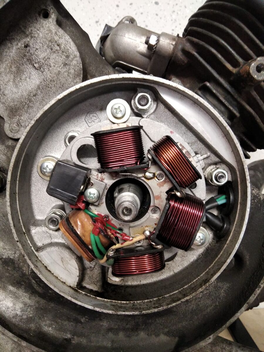 Ich hab die ZGP noch mal im ausgebauten Zustand angeschaut und die Ladespule und Pickup nachgemessen. Das Pickup hat 111,3 Ohm, die Ladespule hat 473 Ohm. Gemessen an den Kabelklemmen die an die CDI geklemmt werden. Also sind die Leitungen auch funktionsfähig. Allerdings sehen die Lötpunkte auf der ZGP wirklich nicht besonders gut aus, hier ist etwas Nacharbeit angesagt um das ordentlich zu machen.