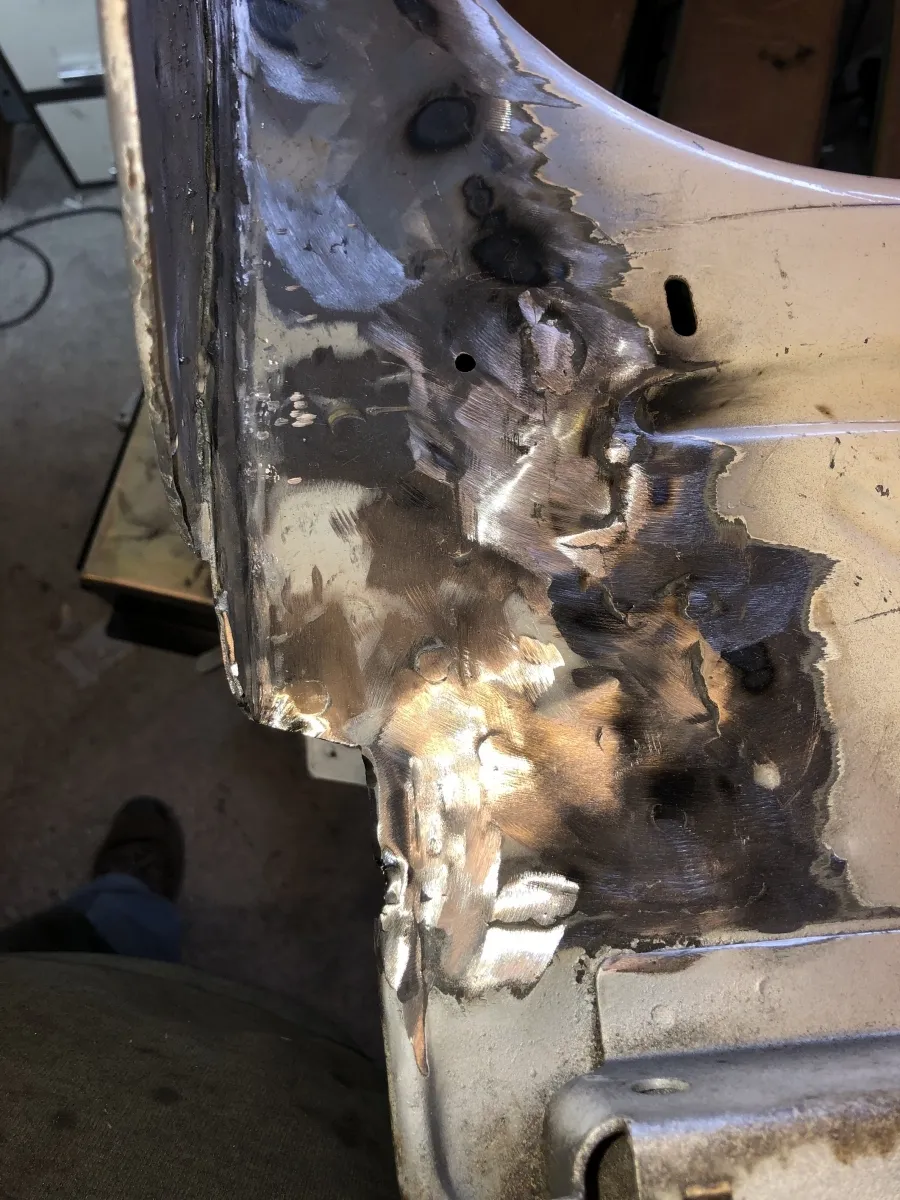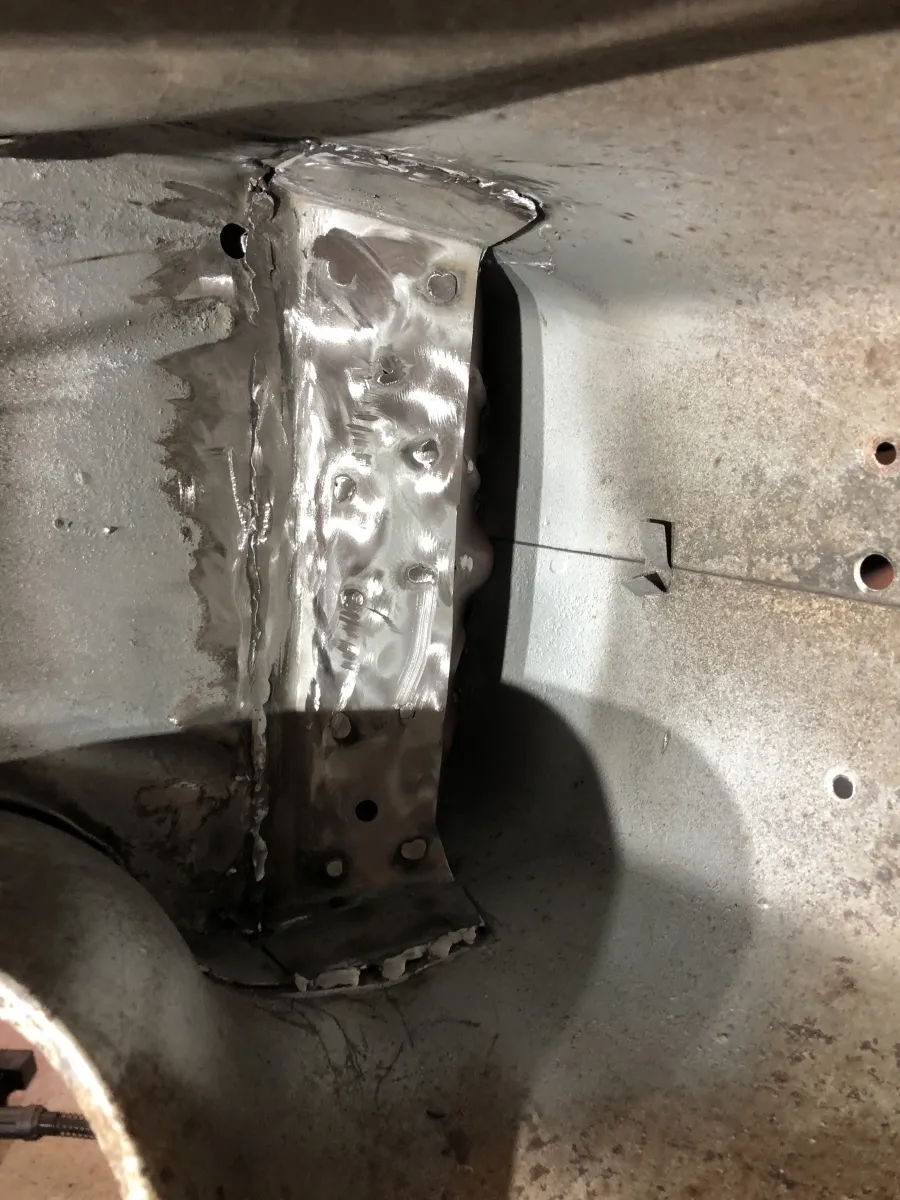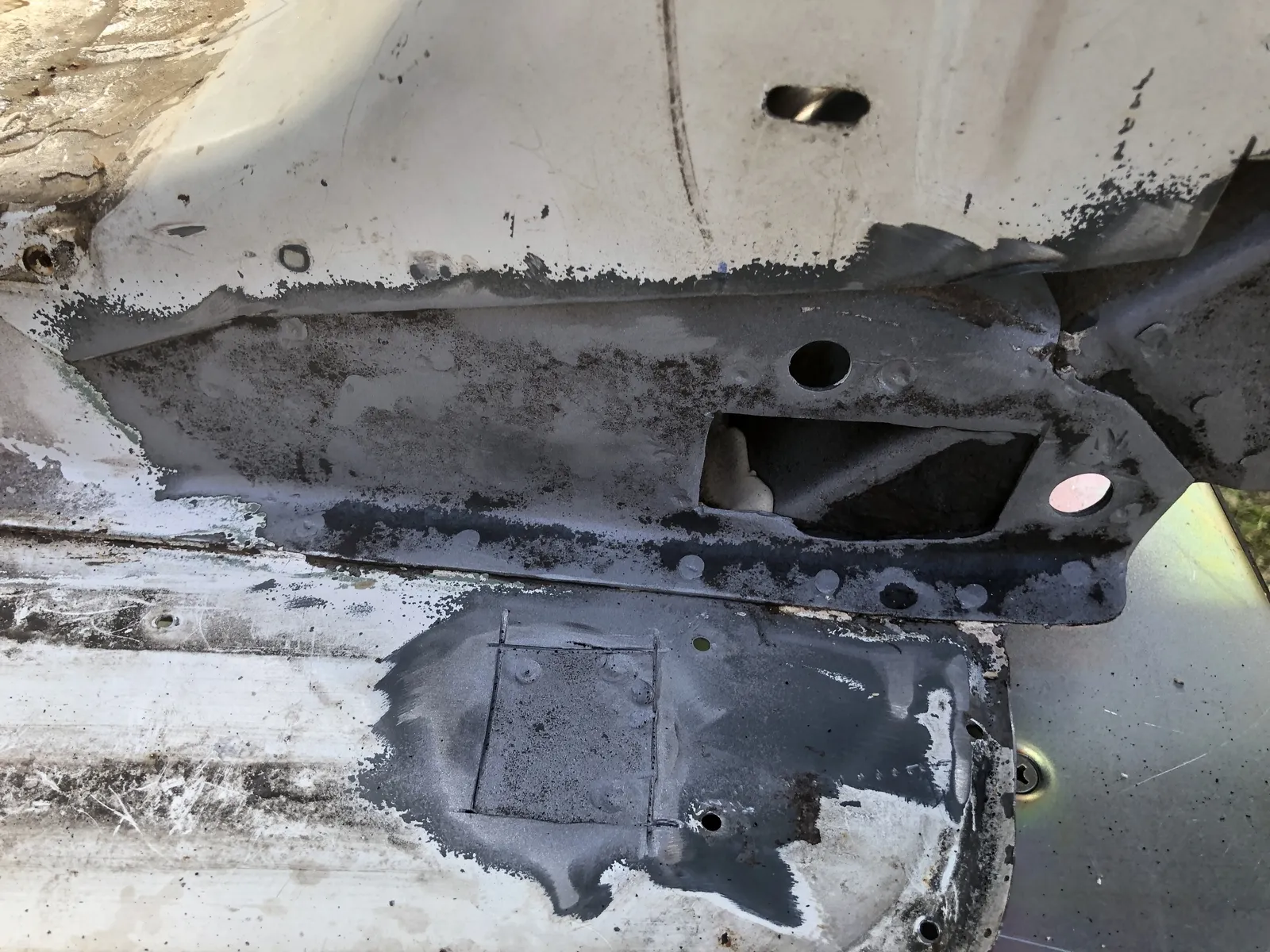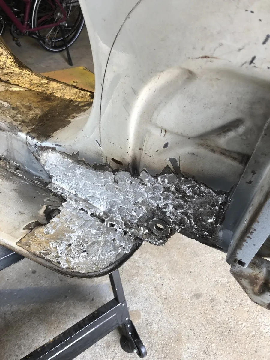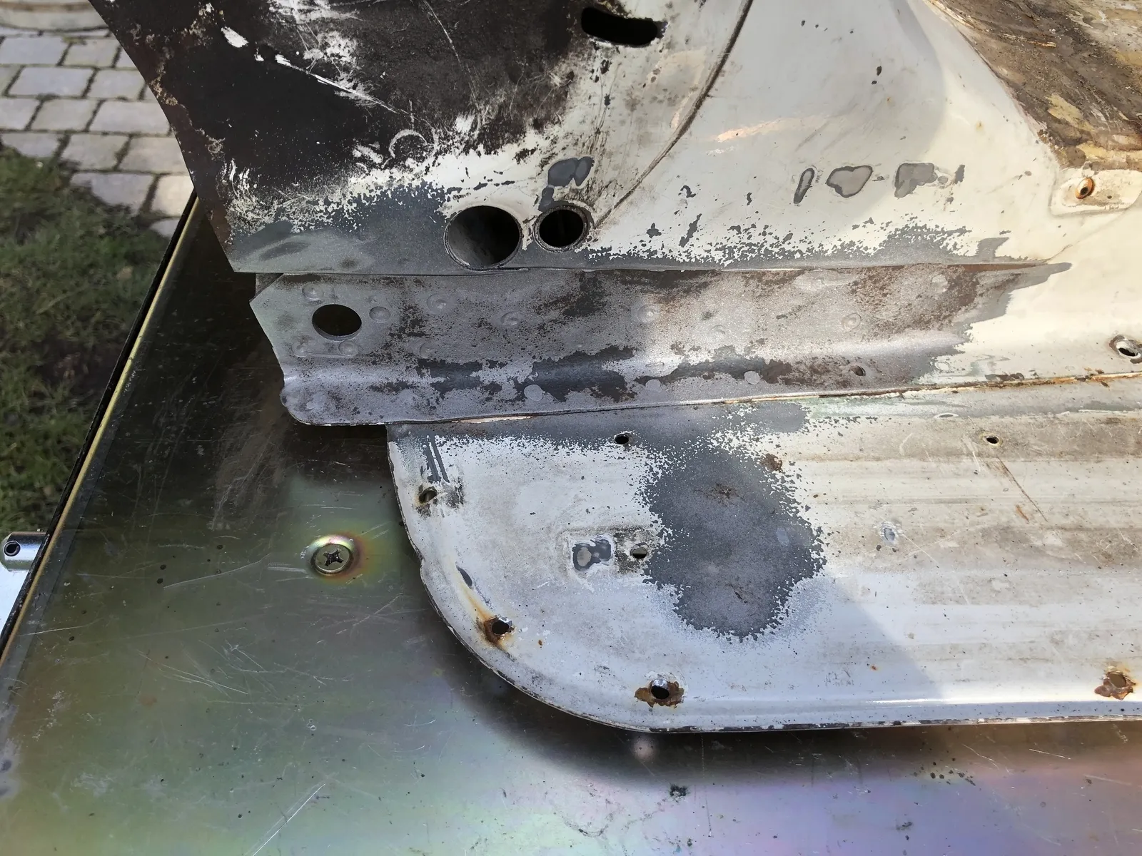 Auf der rechten Seite musste ich jetzt auch am Trittblech an der gleichen Stelle wie links noch etwas rausschneiden. Ich hab lange versucht die zwei Rostpickel da zu ignorieren, aber nach dem Strahlen führte kein Weg mehr dran vorbei.