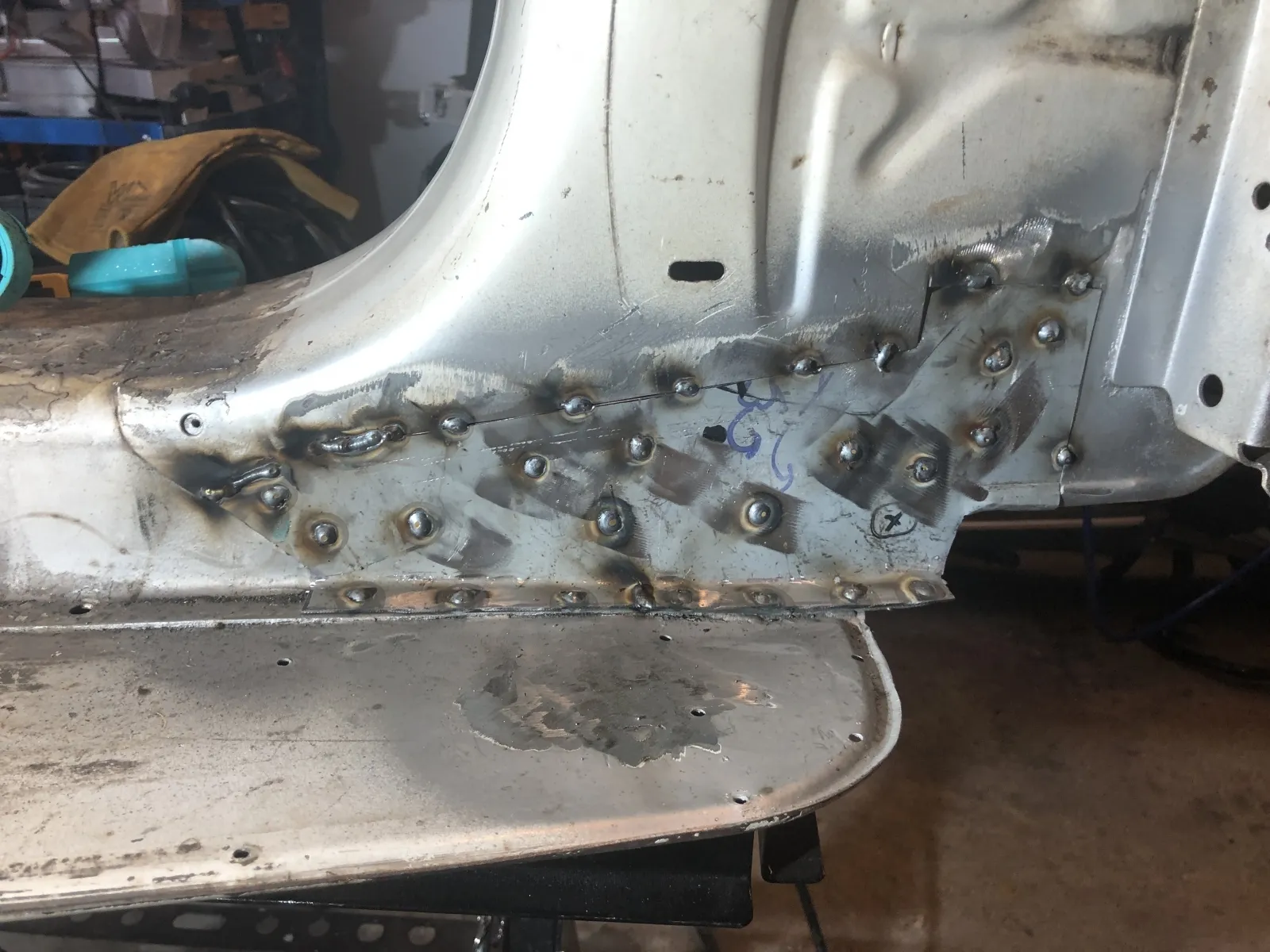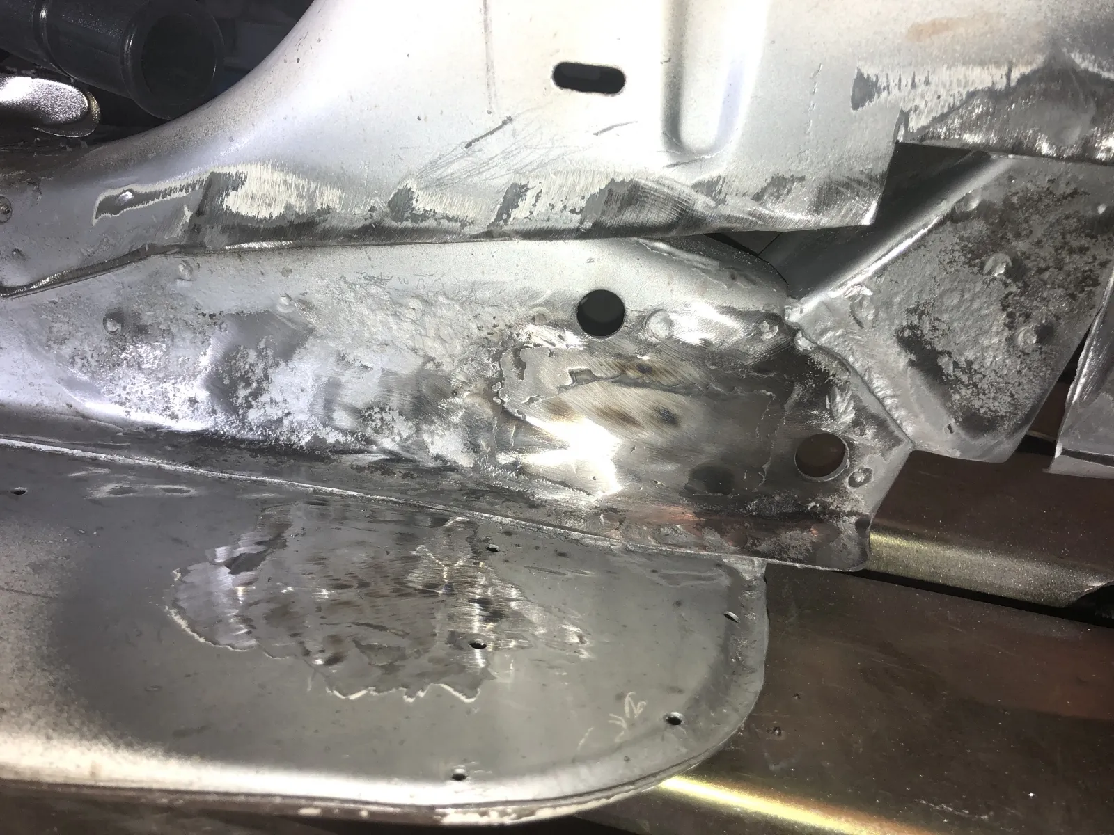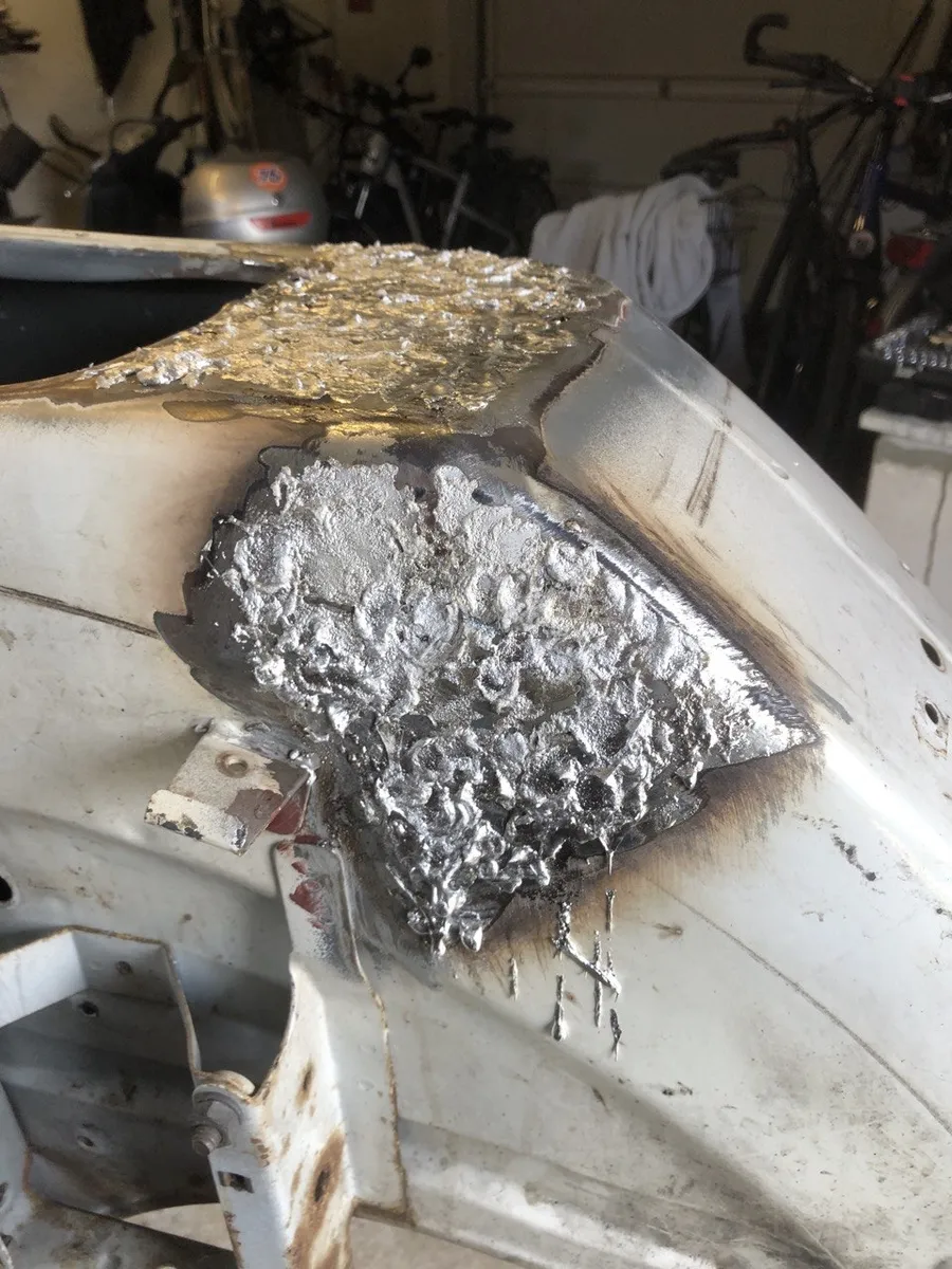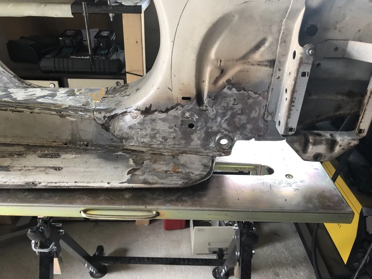 Auf der rechten Seite musste ich jetzt auch am Trittblech an der gleichen Stelle wie links noch etwas rausschneiden. Ich hab lange versucht die zwei Rostpickel da zu ignorieren, aber nach dem Strahlen führte kein Weg mehr dran vorbei.