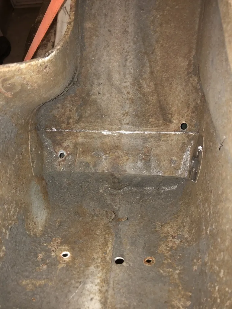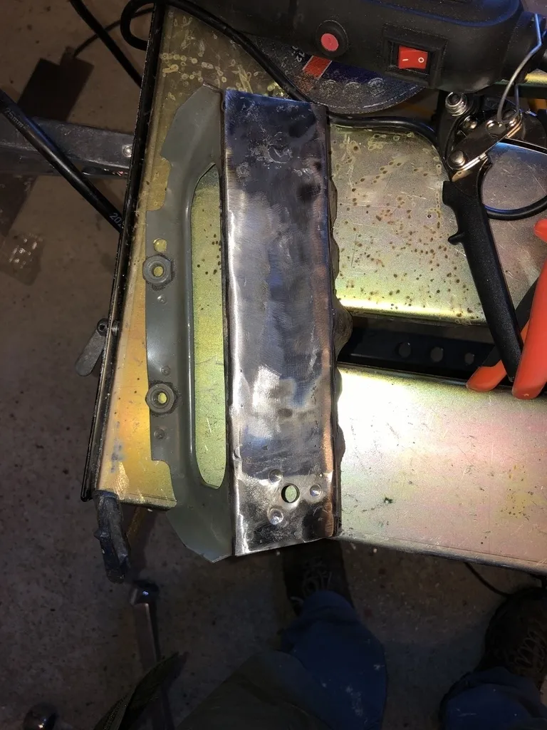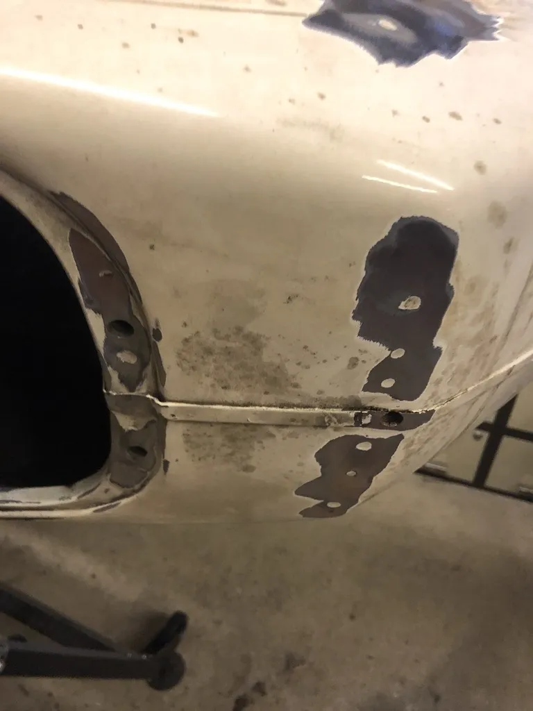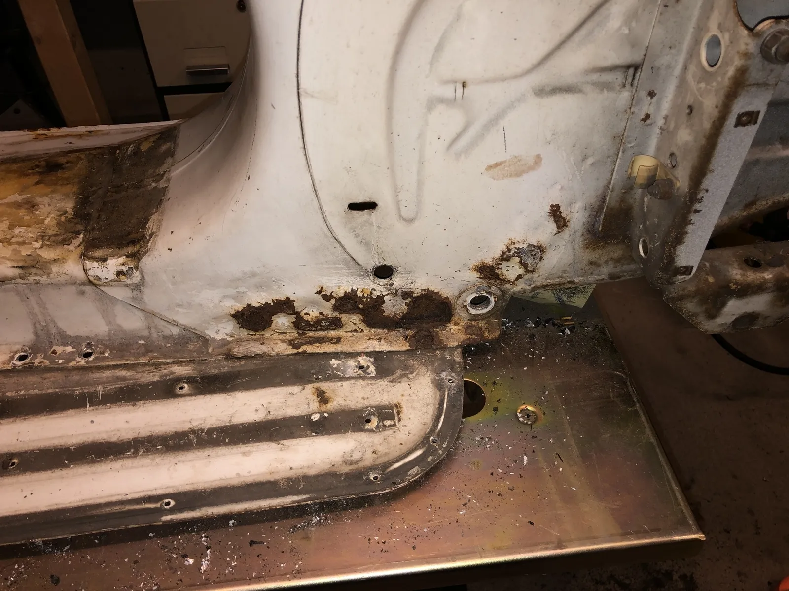 Aus dem Kasten dann das marode Blech ausgesägt. Ein entsprechendes Ersatzblech in 1,5 mm Stärke ausgeflext, eingepunktet, noch 4 Löcher vom Schweißpunktbohren zugeschweisst und dann verschliffen.