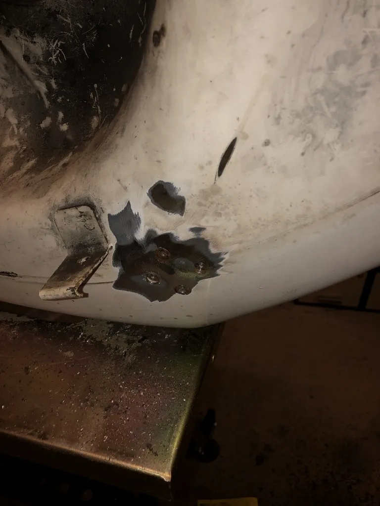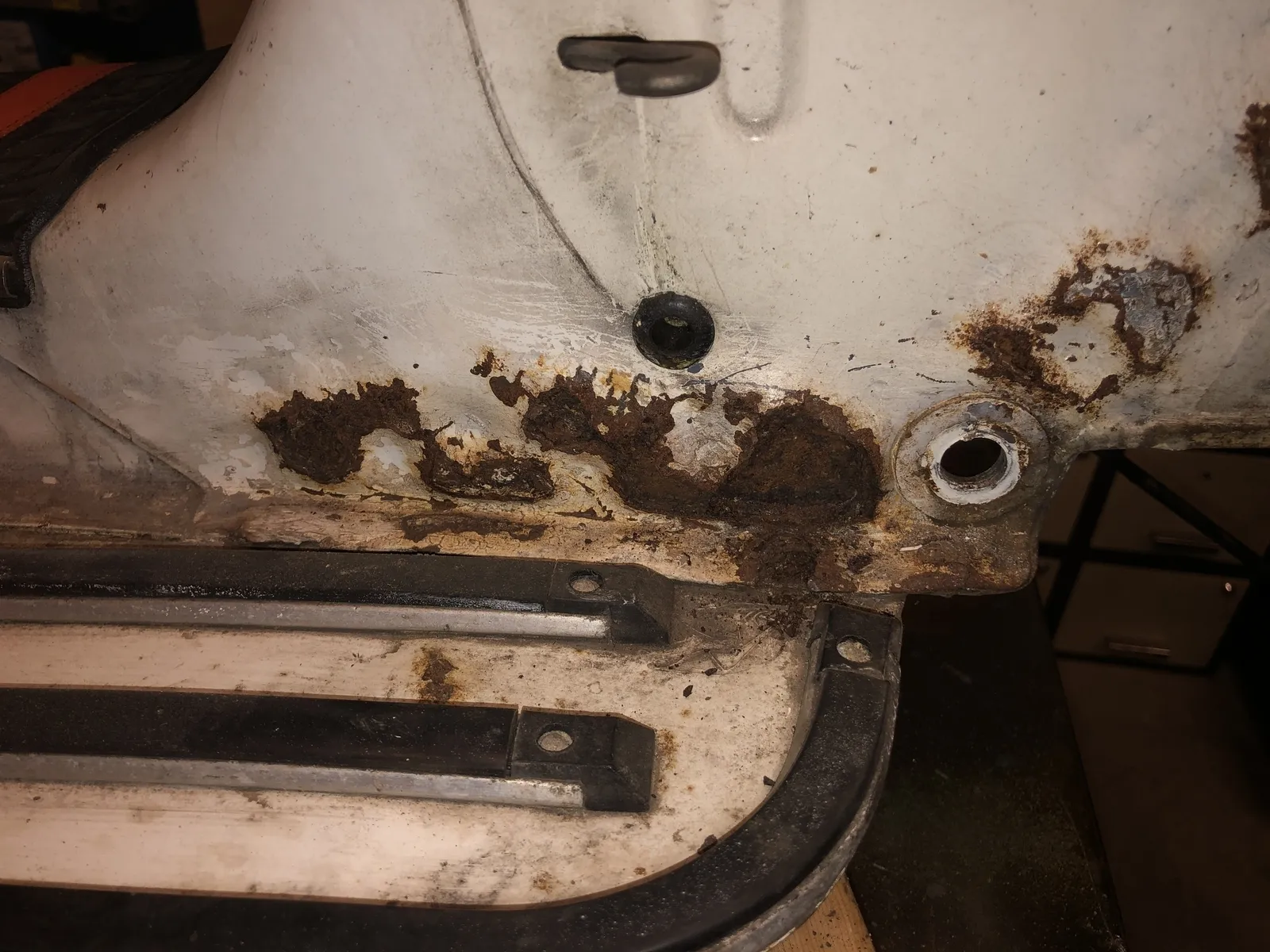 An einer Seite hatte ich einen Schweisspunkt übersehen und mit dem Trennmeißel etwas zu enthusiastisch draufgehauen, da bin ich dann durchs Außenblech. Aber egal, da war eh ein Schweißpunkt rostpickelig, so dass ich da eh ein Stück ausschneiden wollte.