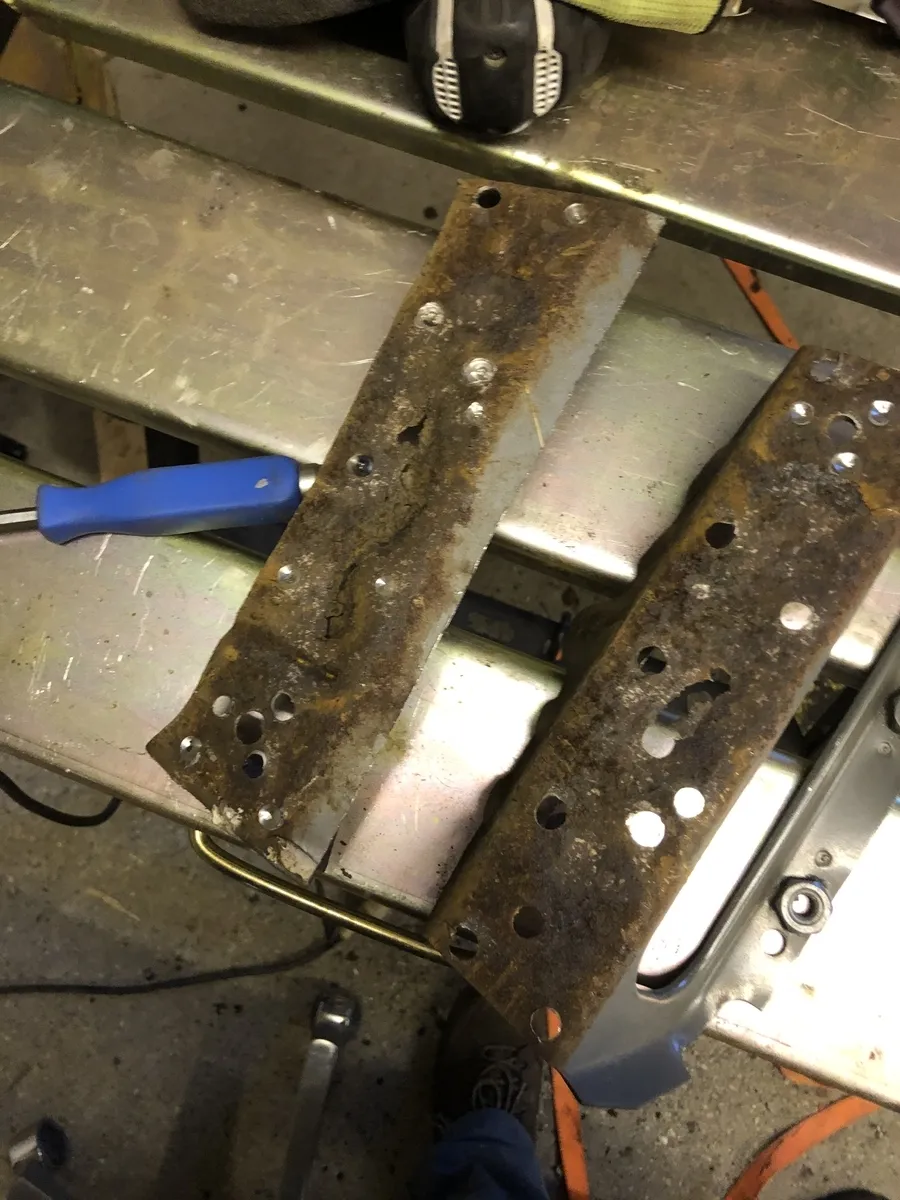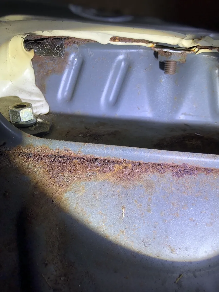 Eigentlich hatte ich vor, nur in der Mitte das Blech in dem Kasten auszuschneiden und was neues einzusetzen. Aber ich glaube ich trenne die beiden Bleche jetzt doch erst, denn im Übergangsbereich brodelt der Rost , da komm ich ja sonst gar nicht dran.