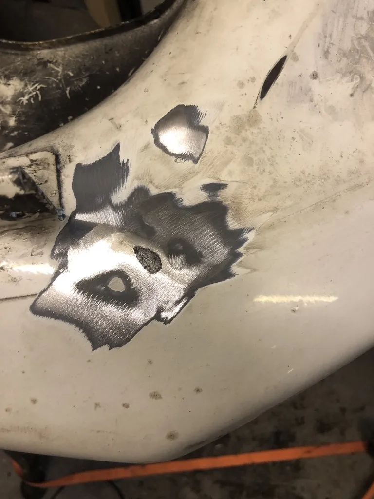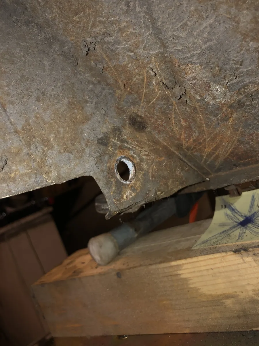 Erst mal die Schweißpunkte zwischen den beiden Blechen aufgebohrt, dann den Lochfraß getrennt.