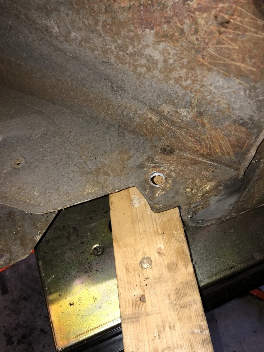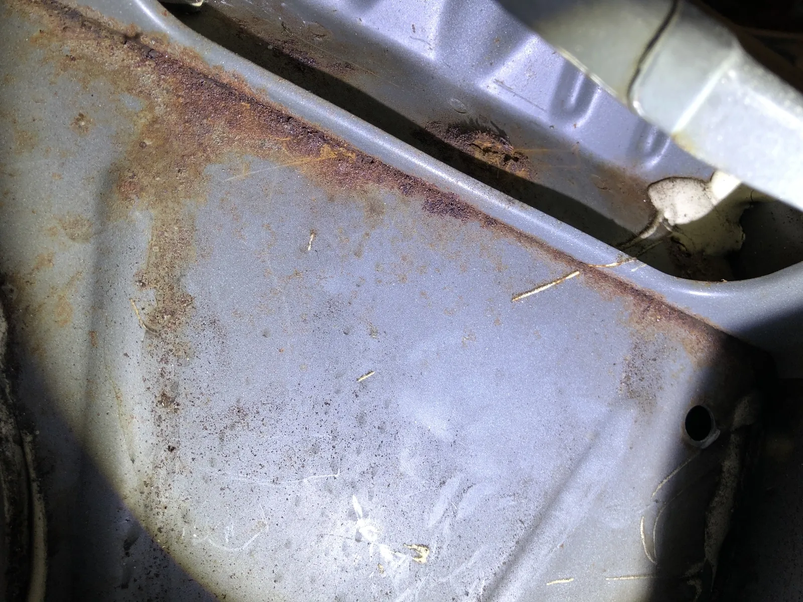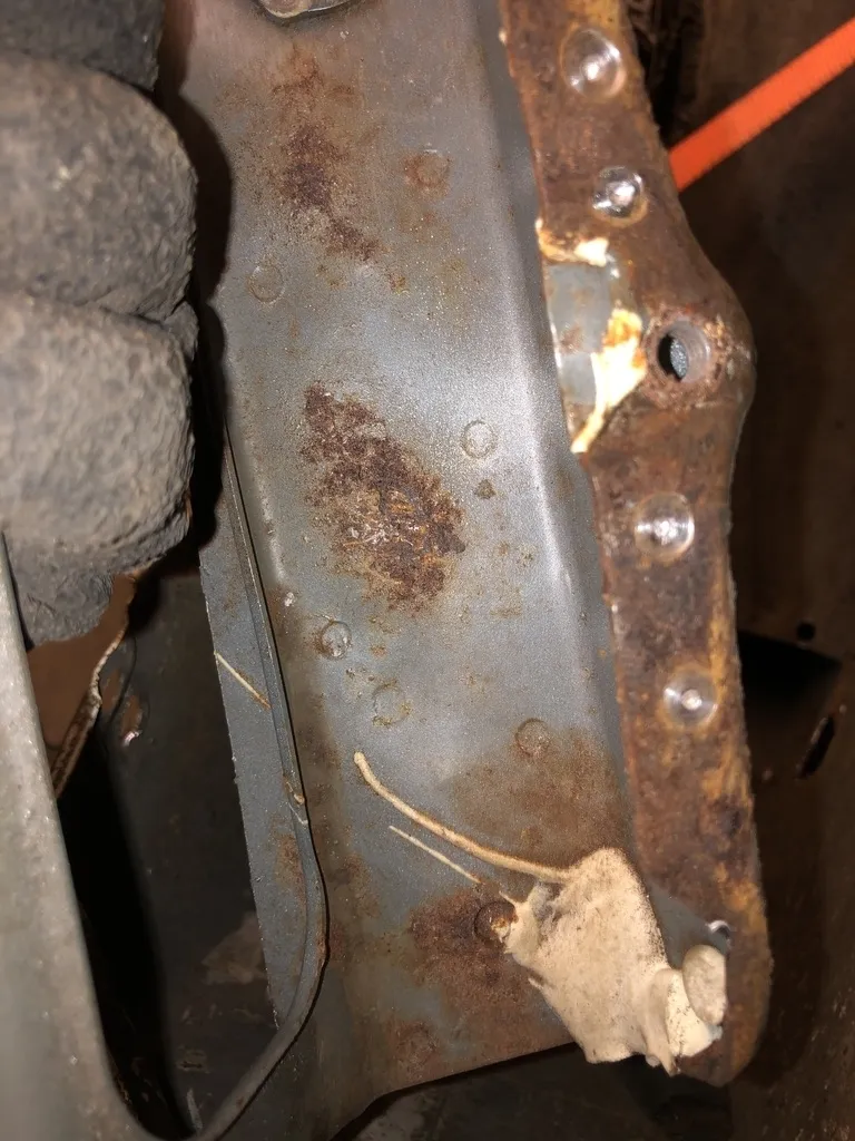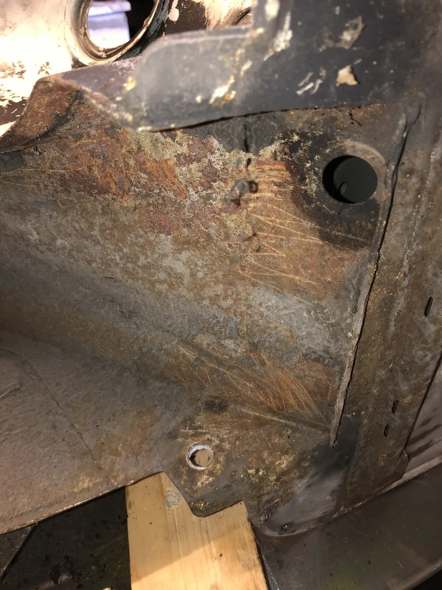 Was unter diesem Blech ist, muss ich mal schauen, ganz durch scheint das alles noch nicht zu sein. Rechts sieht es besser aus, aber etwas Rost ist auch da hinter der Motoraufhängung und da wo das Blech vom Rahmentunnel am Trittbrett verschweisst ist.