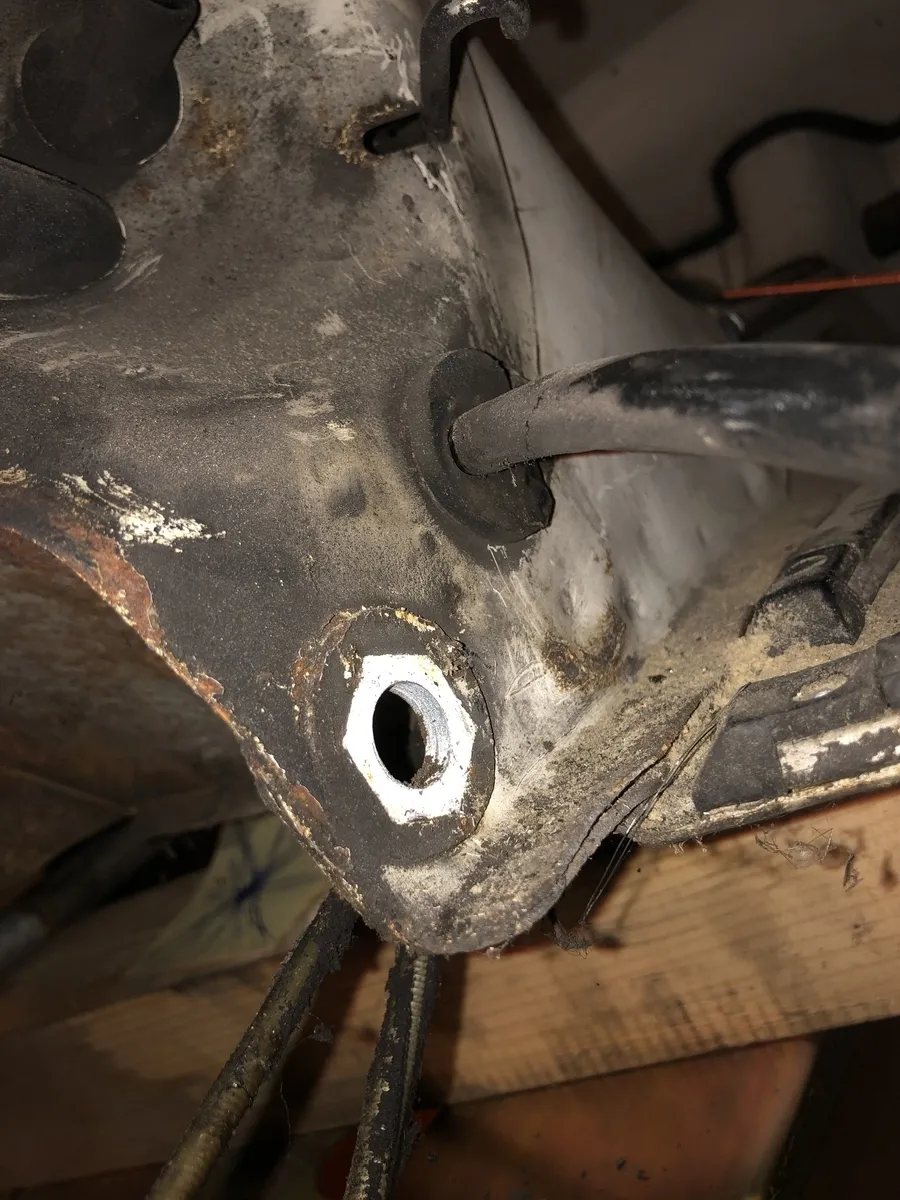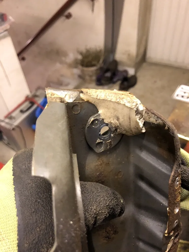 Ein weiterer neuralgischer Punkt ist das Blech in dem auch der Stoßdämper festgeschraubt ist. Die Stoßdämpferaufnahme selber ist in Ordnung, allerdings ist das Blech mittig porös.
