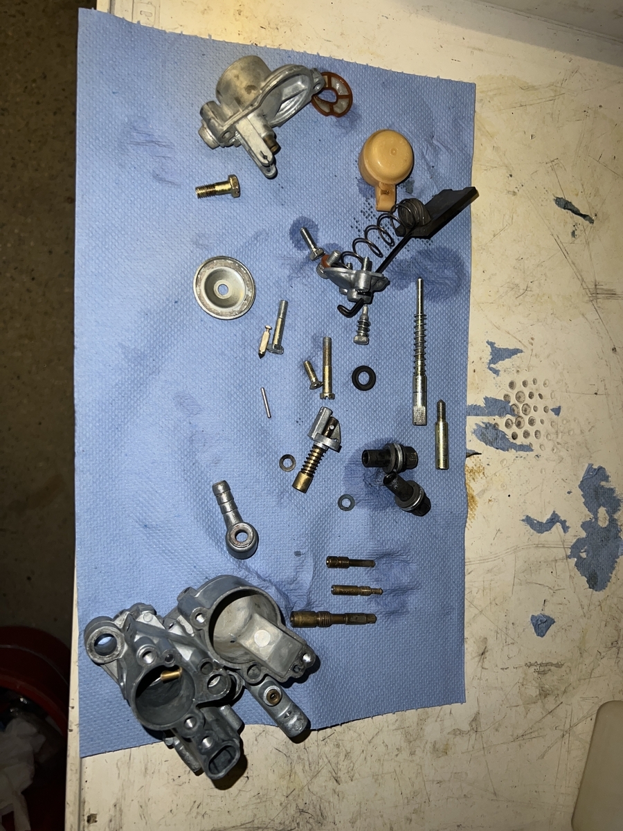 Heute war ich nicht so lange in der Garage, ist einfach zu kalt da. Aber den Vergaser hab ich zerlegt. War ordentlich verharzt. Der Schieber bewegte sich keinen Milimeter. Nach einem Bad in Aceton und dann ne halbe Stunde bei 55 Grad im Ultraschallreiniger ging alles problemlos auseinander.