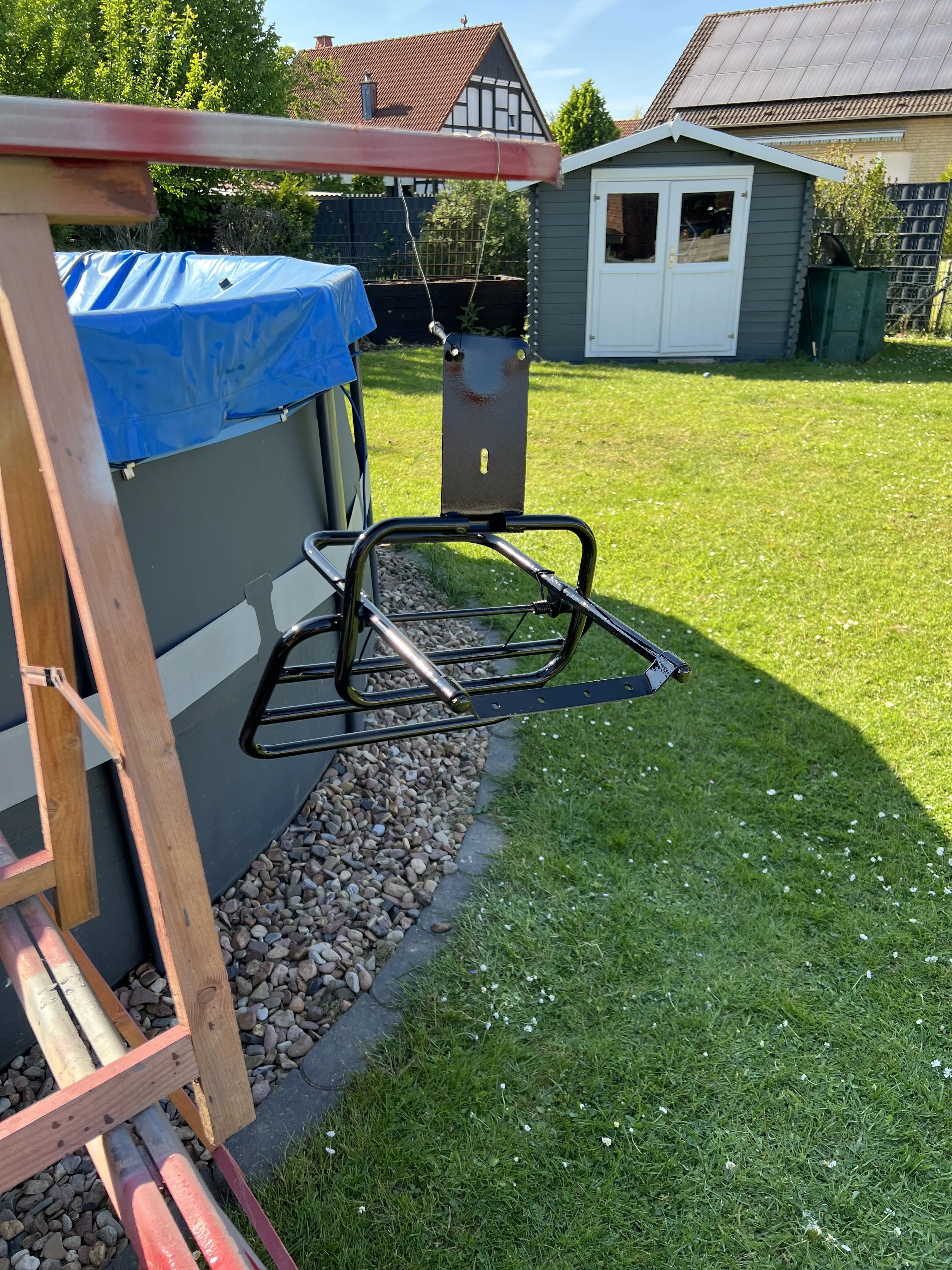Dann grundiert und wieder schwarz lackiert und eben angeschraubt. Die Tasche hatte ich noch liegen, hatte ich mal auf der Bajaj drauf.
