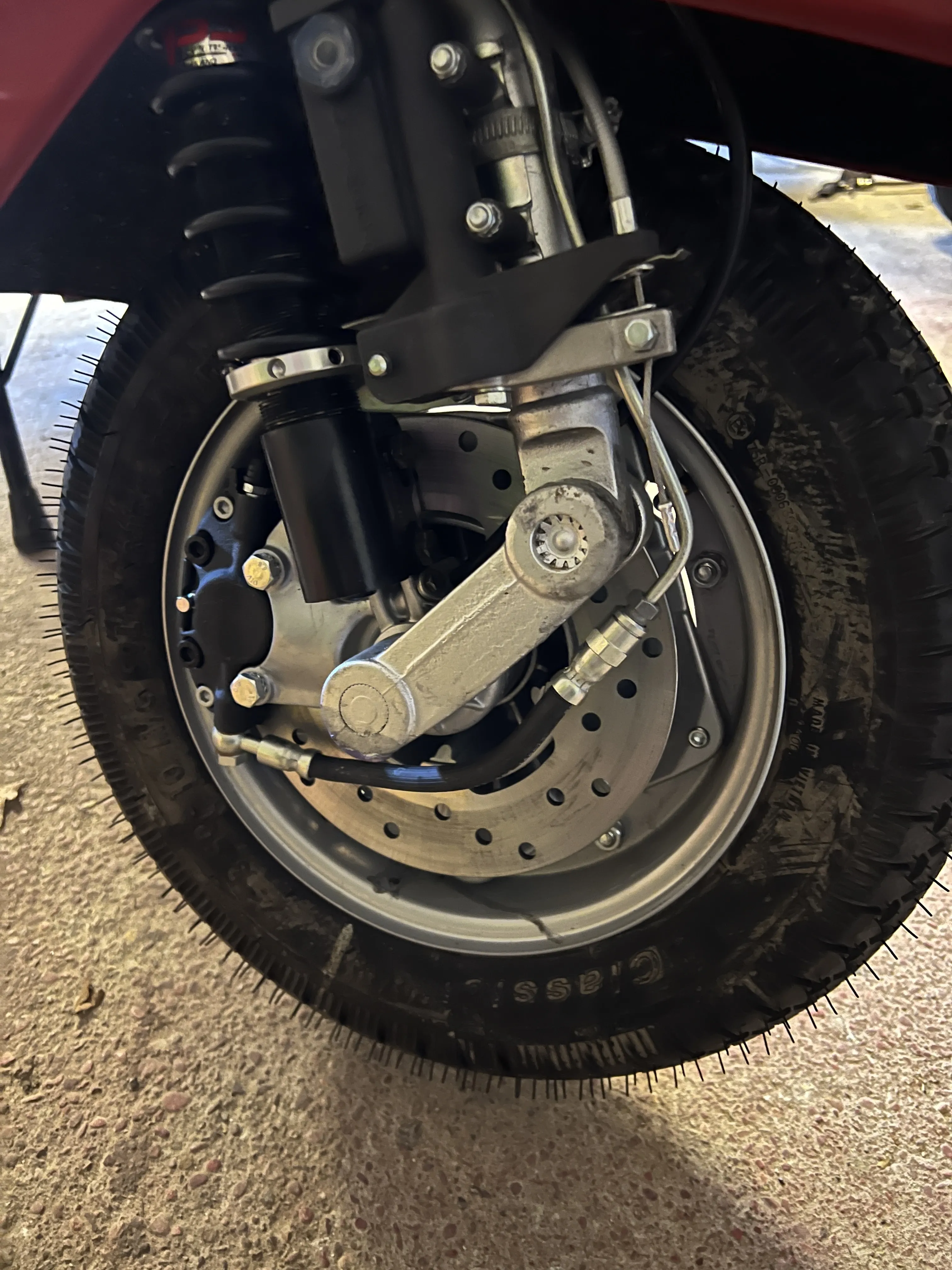 Habe die PX heute mal umgerüstet auf teilhydraulische Scheibenbremse, da ich es leid war, immer den Fuß in Bremsbereitschaft zu halten, da vorne eh nicht viel kommt.