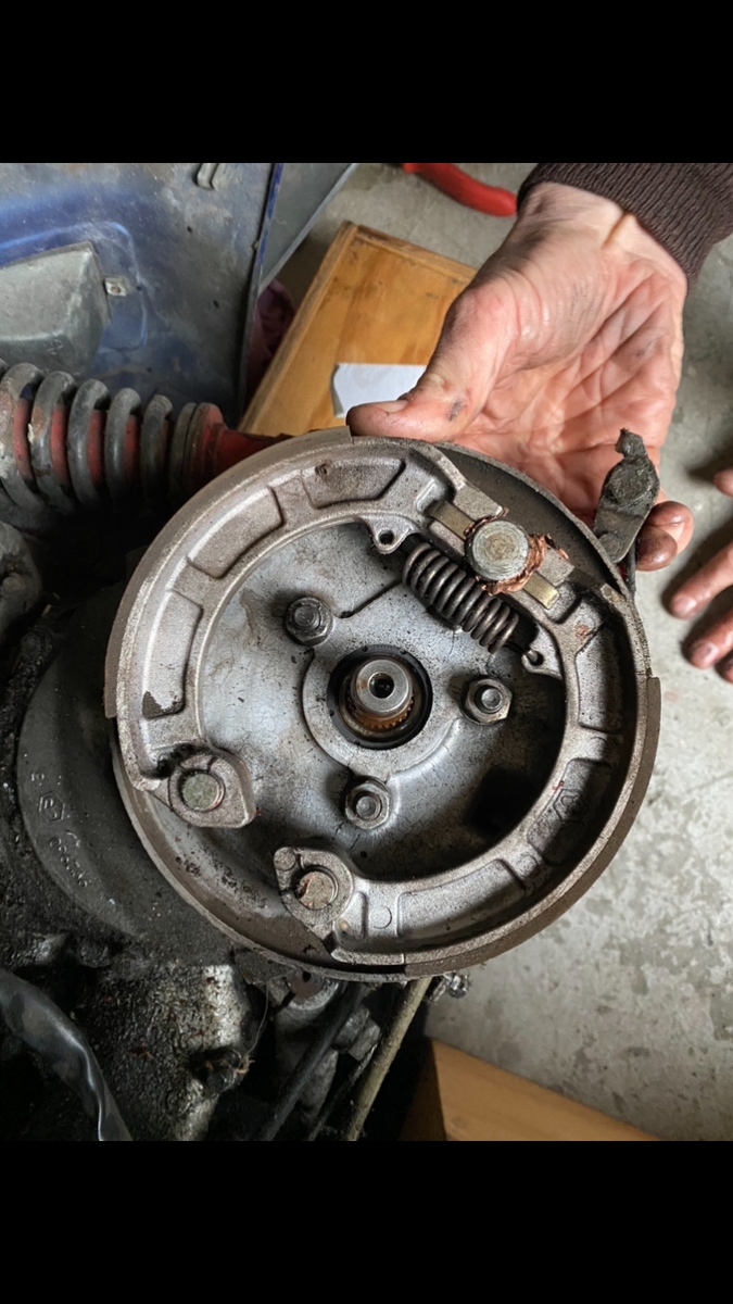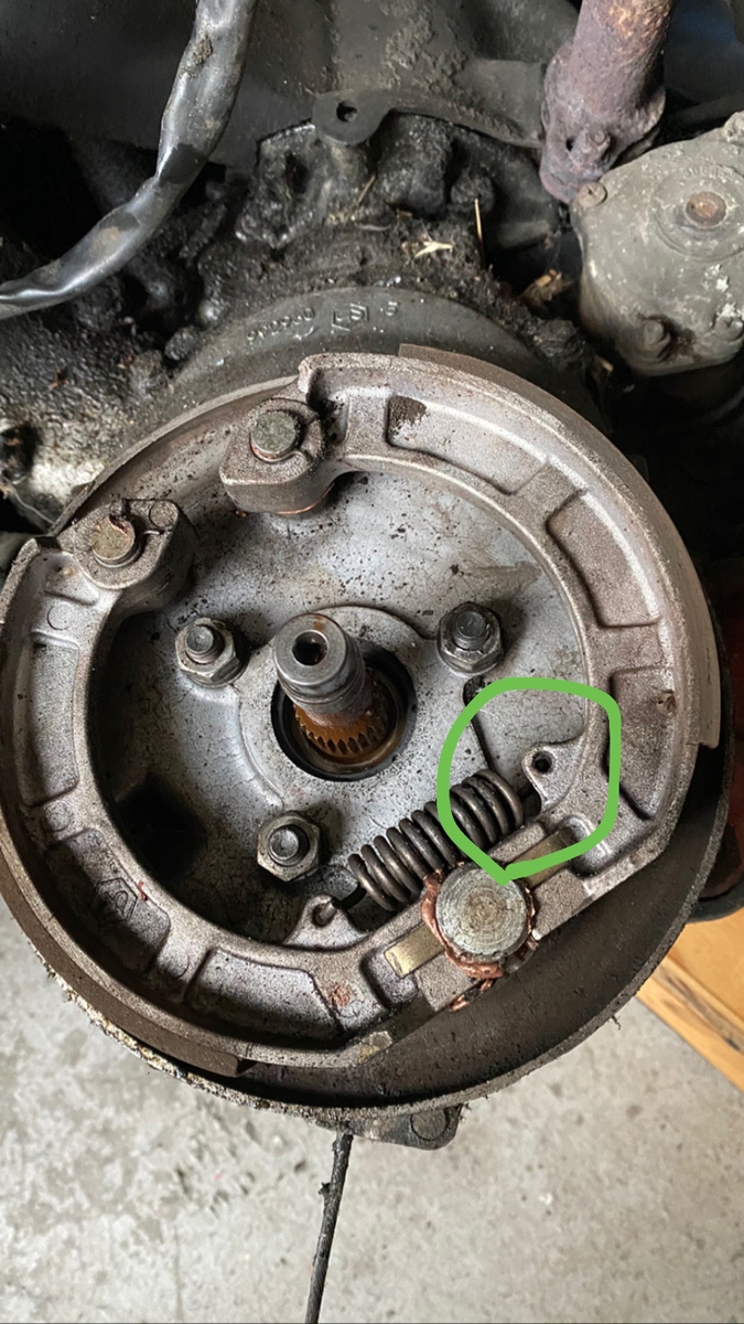 1.Die Feder die die beiden Bremsbacken in Ausgangsposition zieht hing nur noch auf einer Seite drin (siehe grüne Markierung)