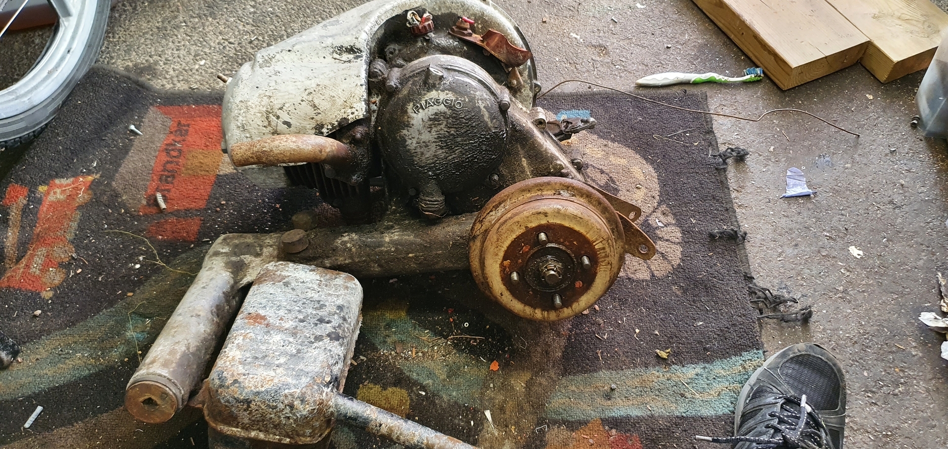 Ich habe gestern einen alten Vespamotor auf einem Dachboden gefunden.