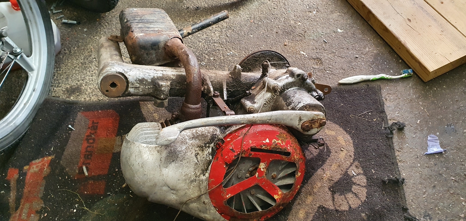 Ich habe gestern einen alten Vespamotor auf einem Dachboden gefunden.