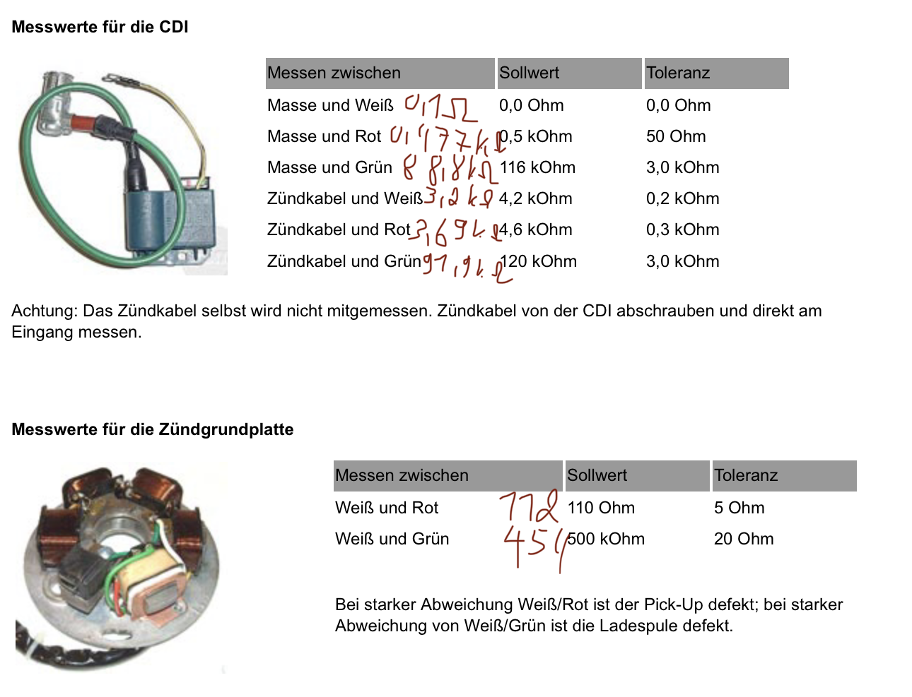 Habe auch mal die teile durchgemessen, dieses Ergebnis sagt mir aber das, dass PickUp Oky sei. Ein seltsamer Messwert habe ich an der CDI zwischen Masse und Grün, da habe ich statt 116kOhm nur 88,8kOhm.