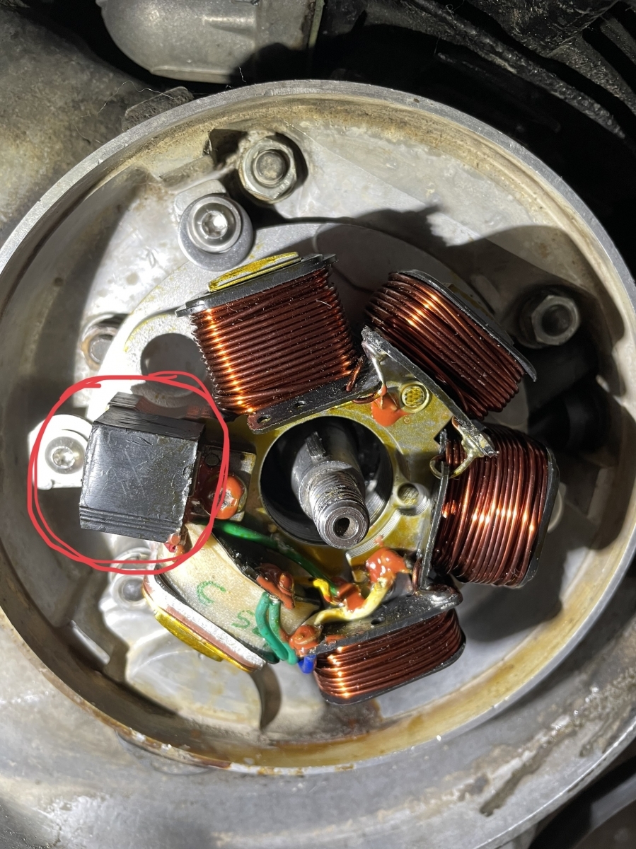 • Ich habe die Zündung zum laufen gebracht. Habe noch mal das Polrad abgebaut und die ZGP abgenommen. Dann habe ich die Kontakte des PickUp´s etwas angeraut (auf dem Bild rot umrandet) und wieder zusammen gebaut. Und siehe da es läuft auf einmal.